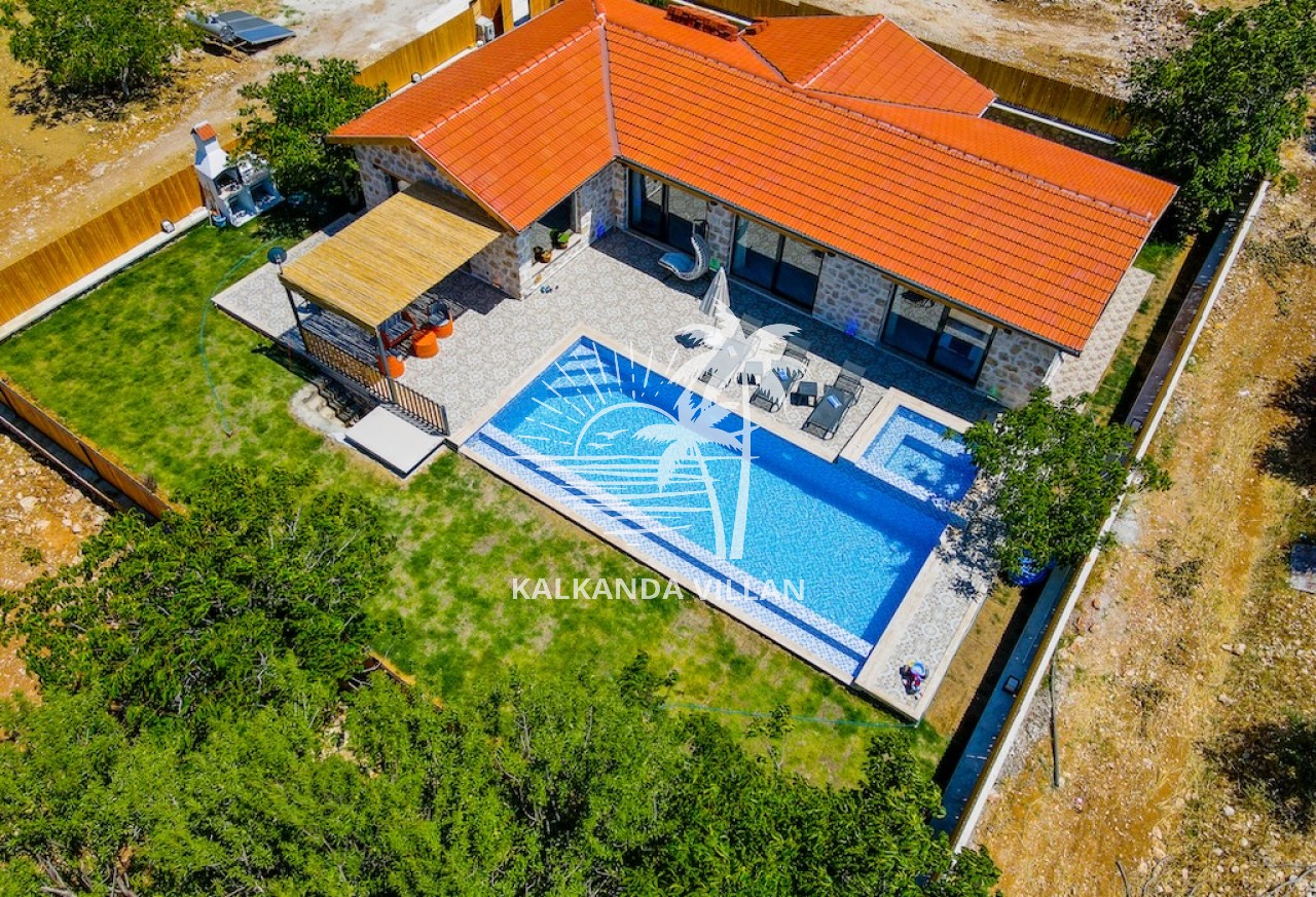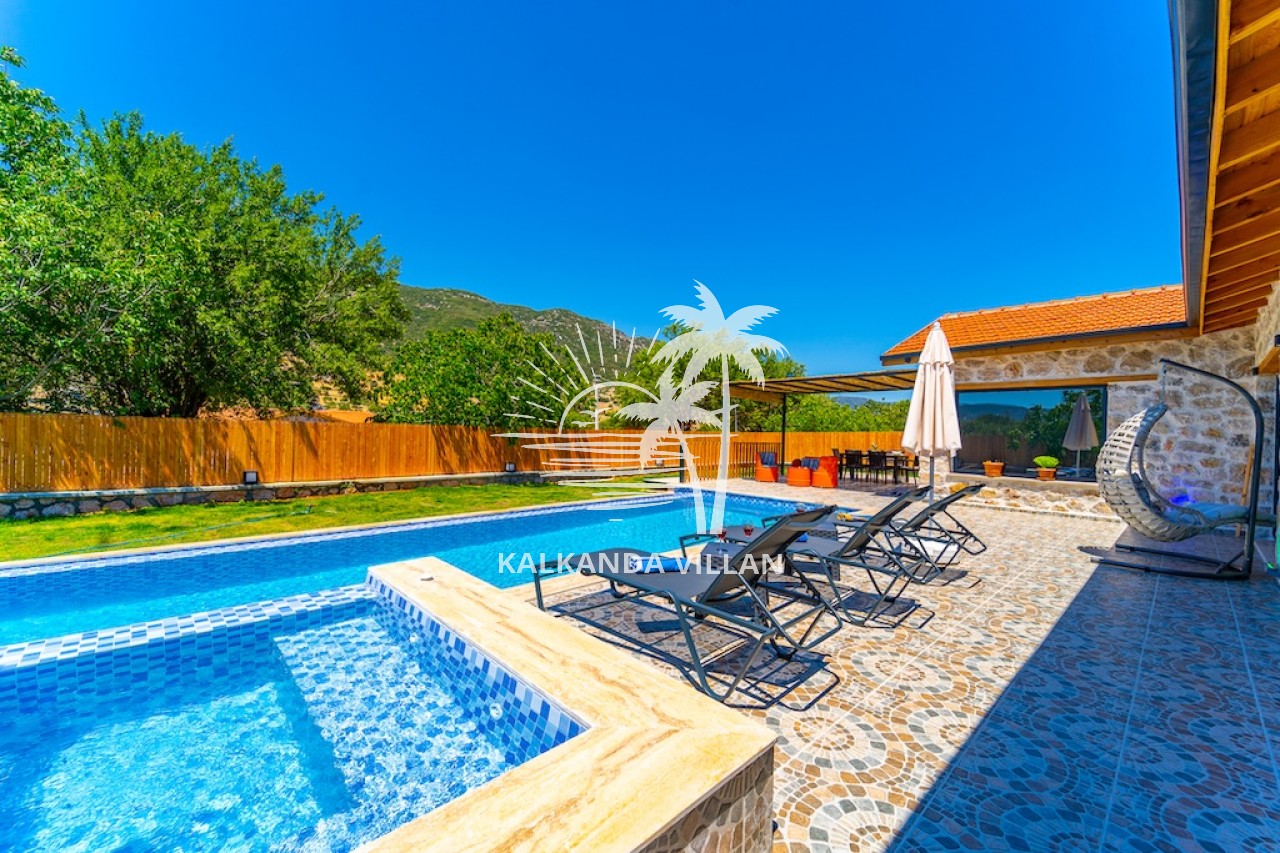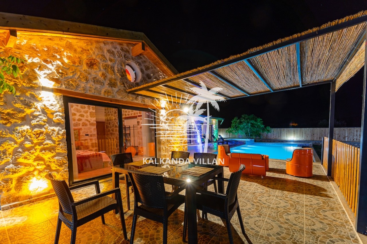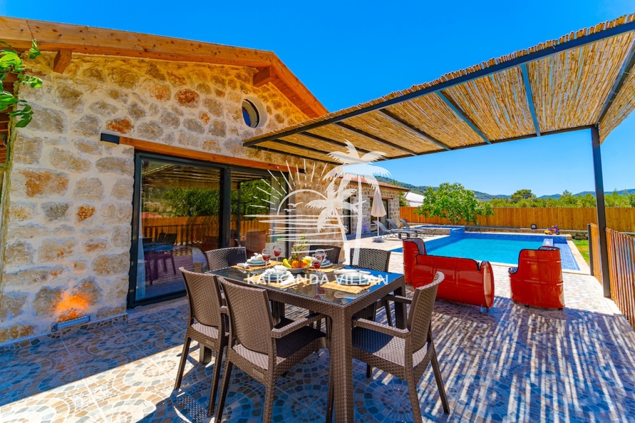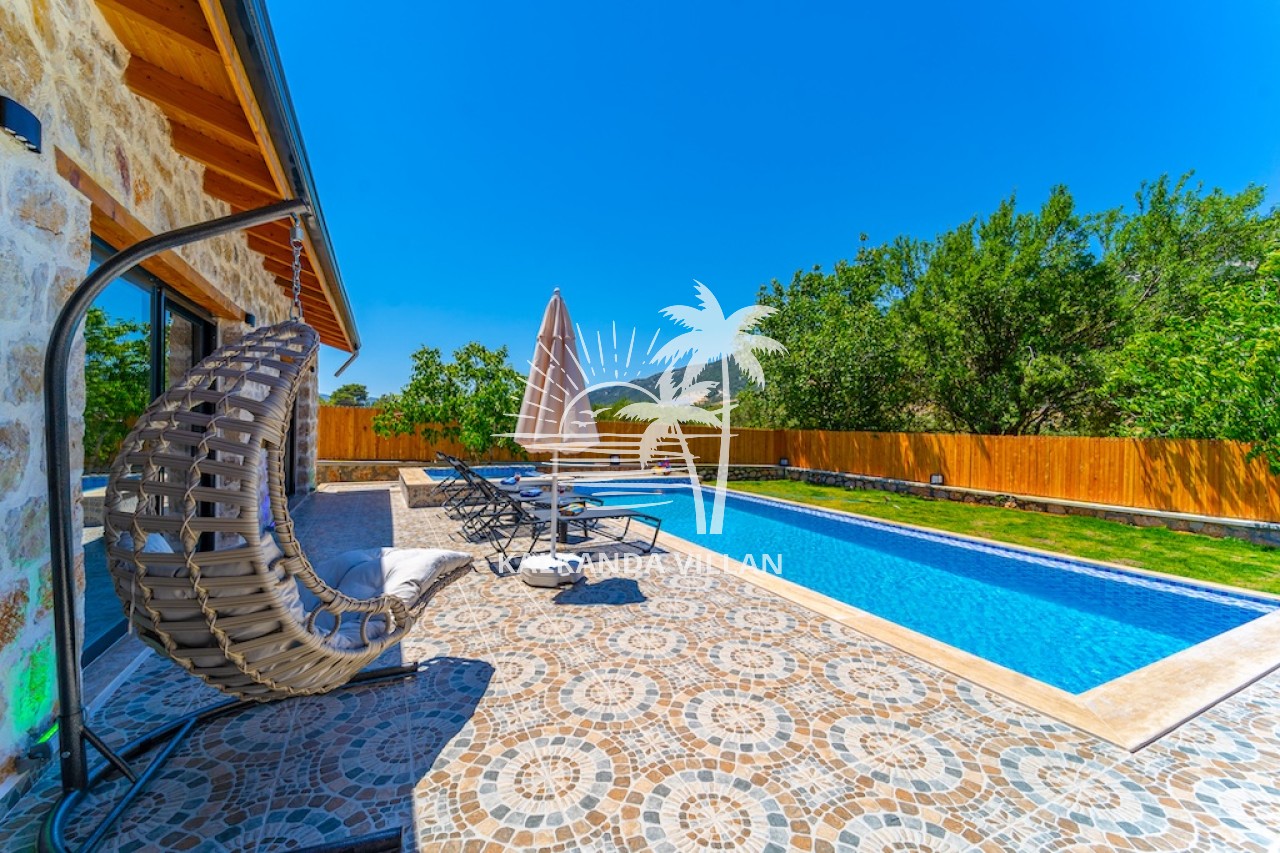 Die Villa Cevizici ist eine geräumige und komfortable Ferienvilla in Sarıbelen, einem beliebten Ferienort in Kalkan, Antalya, inmitten herrlicher Natur. Die Villa besticht durch ihre Architektur aus Stein und Holz und bietet mit ihrer modernen Einrichtung und der ruhigen Atmosphäre unvergessliche Urlaubsmomente. Sie verfügt über zwei Schlafzimmer und zwei Badezimmer und bietet Platz für bis zu vier Personen – ideal für kleine Familien oder Freundesgruppen. Genießen Sie die Natur im Freien mit privatem Pool, separatem Kinderbecken, Poolterrasse und Sonnenliegebereich. Die moderne amerikanische Küche und das großzügige Wohnzimmer der Villa Cevizici sorgen für ein komfortables Ambiente. Der private Poolbereich, die Grillmöglichkeiten und der Blick in die Natur schaffen die perfekte Kulisse für einen erholsamen Urlaub. Die Villa Cevizici ist die ideale Wahl für alle, die eine Ferienvilla in Kalkan Sarıbelen suchen und Natur, Privatsphäre und Komfort in einem genießen möchten.