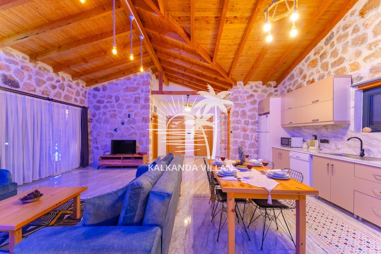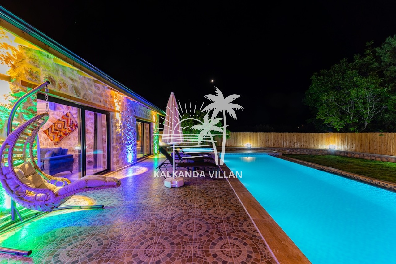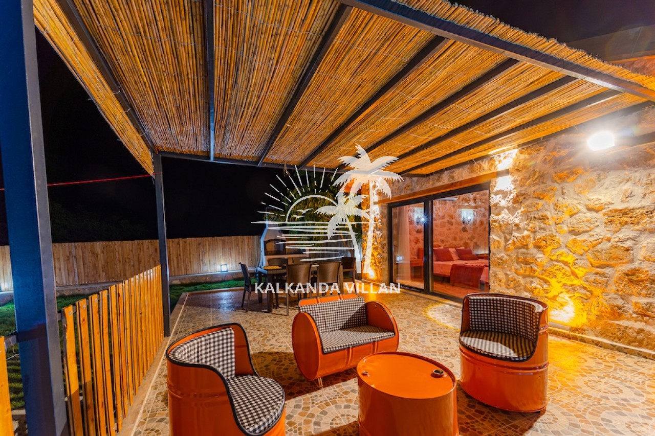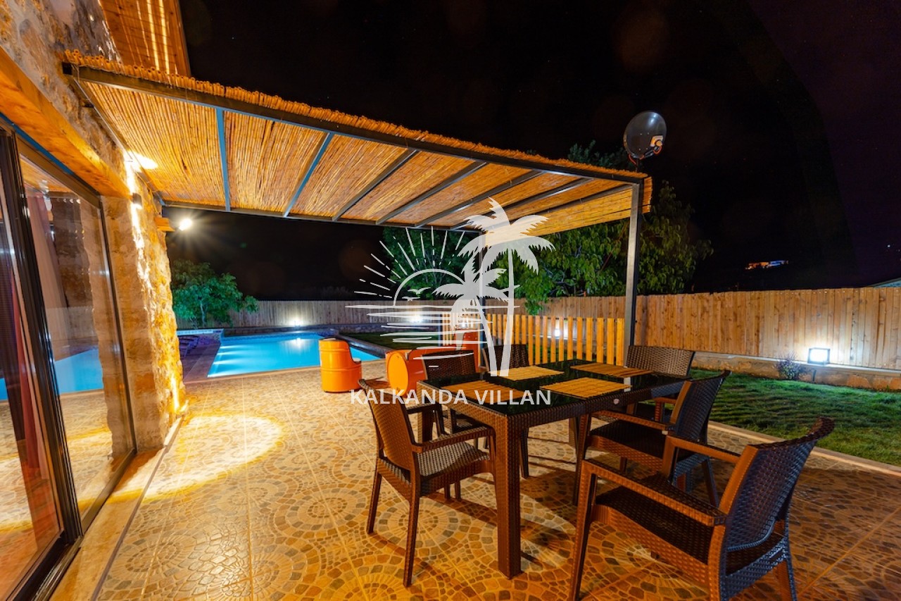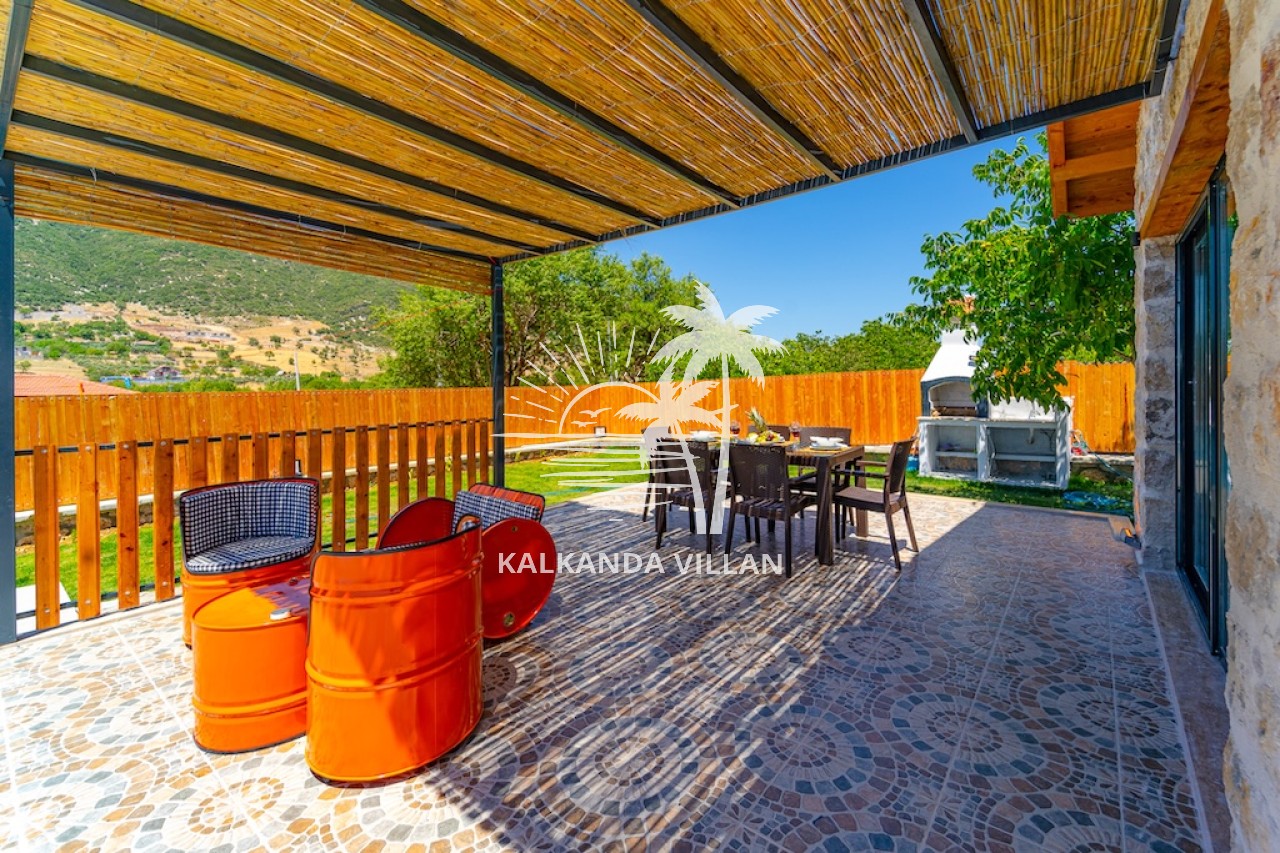Die Villa Cevizici ist eine geräumige und komfortable Ferienvilla in Sarıbelen, einem beliebten Ferienort in Kalkan, Antalya, inmitten herrlicher Natur. Die Villa besticht durch ihre Architektur aus Stein und Holz und bietet mit ihrer modernen Einrichtung und der ruhigen Atmosphäre unvergessliche Urlaubsmomente. Sie verfügt über zwei Schlafzimmer und zwei Badezimmer und bietet Platz für bis zu vier Personen – ideal für kleine Familien oder Freundesgruppen. Genießen Sie die Natur im Freien mit privatem Pool, separatem Kinderbecken, Poolterrasse und Sonnenliegebereich. Die moderne amerikanische Küche und das großzügige Wohnzimmer der Villa Cevizici sorgen für ein komfortables Ambiente. Der private Poolbereich, die Grillmöglichkeiten und der Blick in die Natur schaffen die perfekte Kulisse für einen erholsamen Urlaub. Die Villa Cevizici ist die ideale Wahl für alle, die eine Ferienvilla in Kalkan Sarıbelen suchen und Natur, Privatsphäre und Komfort in einem genießen möchten.
