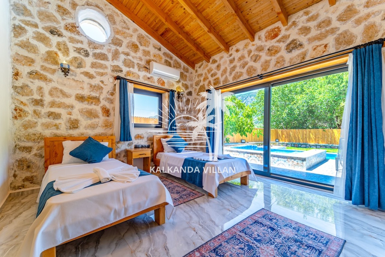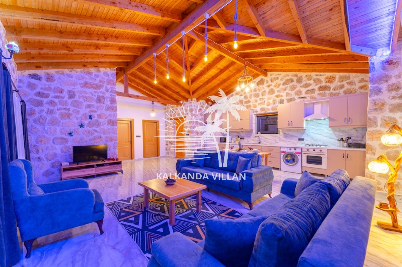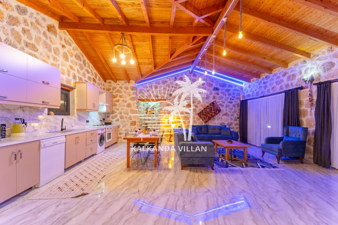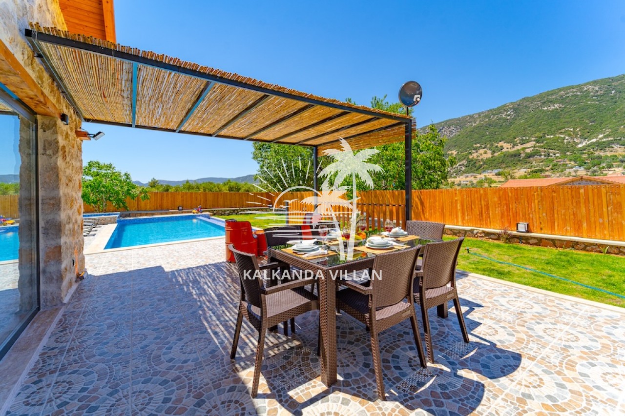 Die Villa Cevizici ist eine geräumige und komfortable Ferienvilla in Sarıbelen, einem beliebten Ferienort in Kalkan, Antalya, inmitten herrlicher Natur. Die Villa besticht durch ihre Architektur aus Stein und Holz und bietet mit ihrer modernen Einrichtung und der ruhigen Atmosphäre unvergessliche Urlaubsmomente. Sie verfügt über zwei Schlafzimmer und zwei Badezimmer und bietet Platz für bis zu vier Personen – ideal für kleine Familien oder Freundesgruppen. Genießen Sie die Natur im Freien mit privatem Pool, separatem Kinderbecken, Poolterrasse und Sonnenliegebereich. Die moderne amerikanische Küche und das großzügige Wohnzimmer der Villa Cevizici sorgen für ein komfortables Ambiente. Der private Poolbereich, die Grillmöglichkeiten und der Blick in die Natur schaffen die perfekte Kulisse für einen erholsamen Urlaub. Die Villa Cevizici ist die ideale Wahl für alle, die eine Ferienvilla in Kalkan Sarıbelen suchen und Natur, Privatsphäre und Komfort in einem genießen möchten.