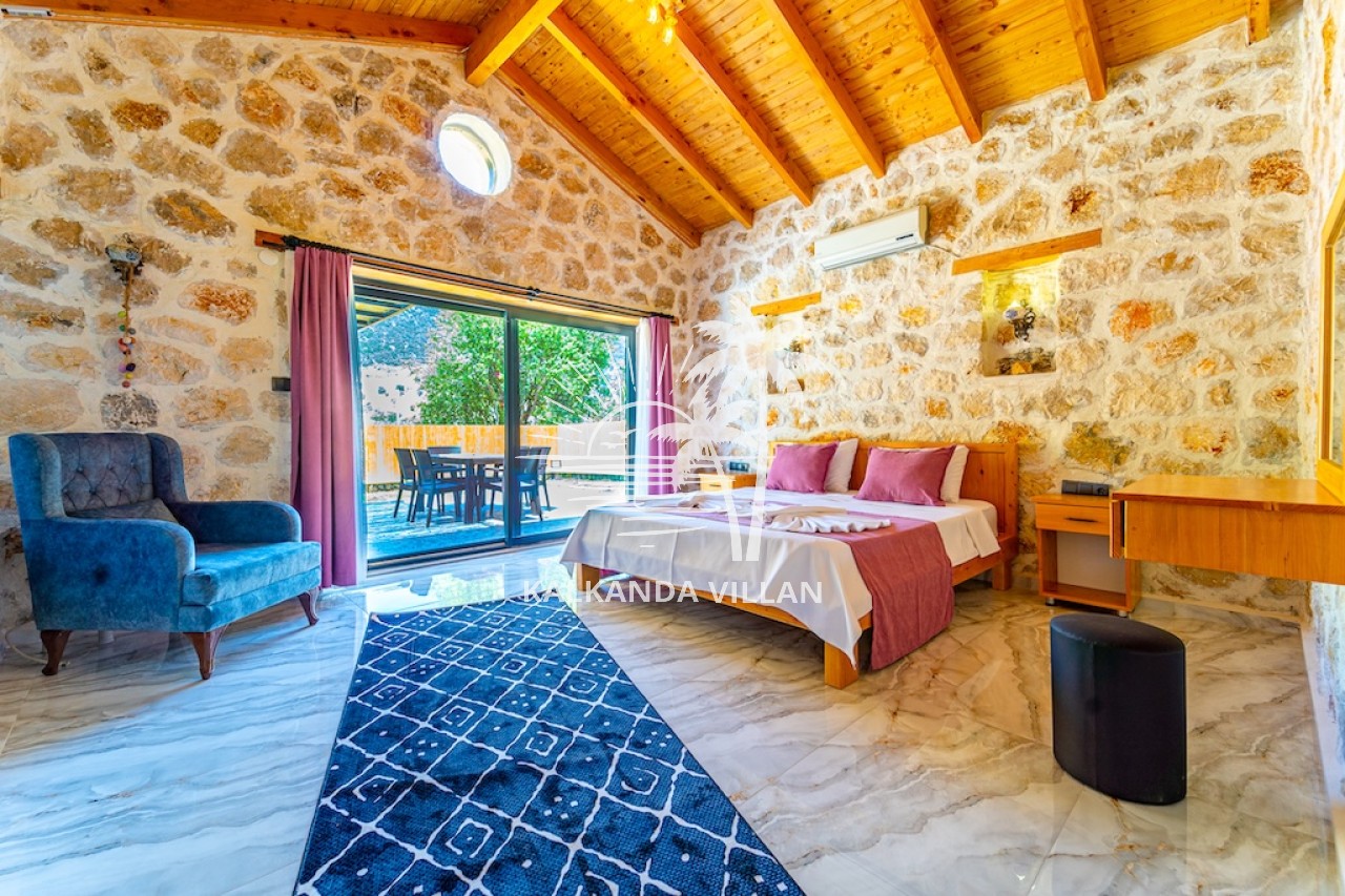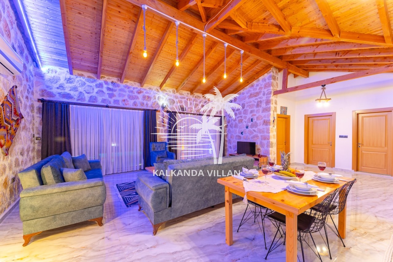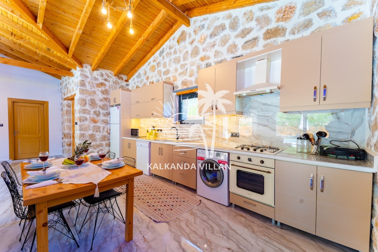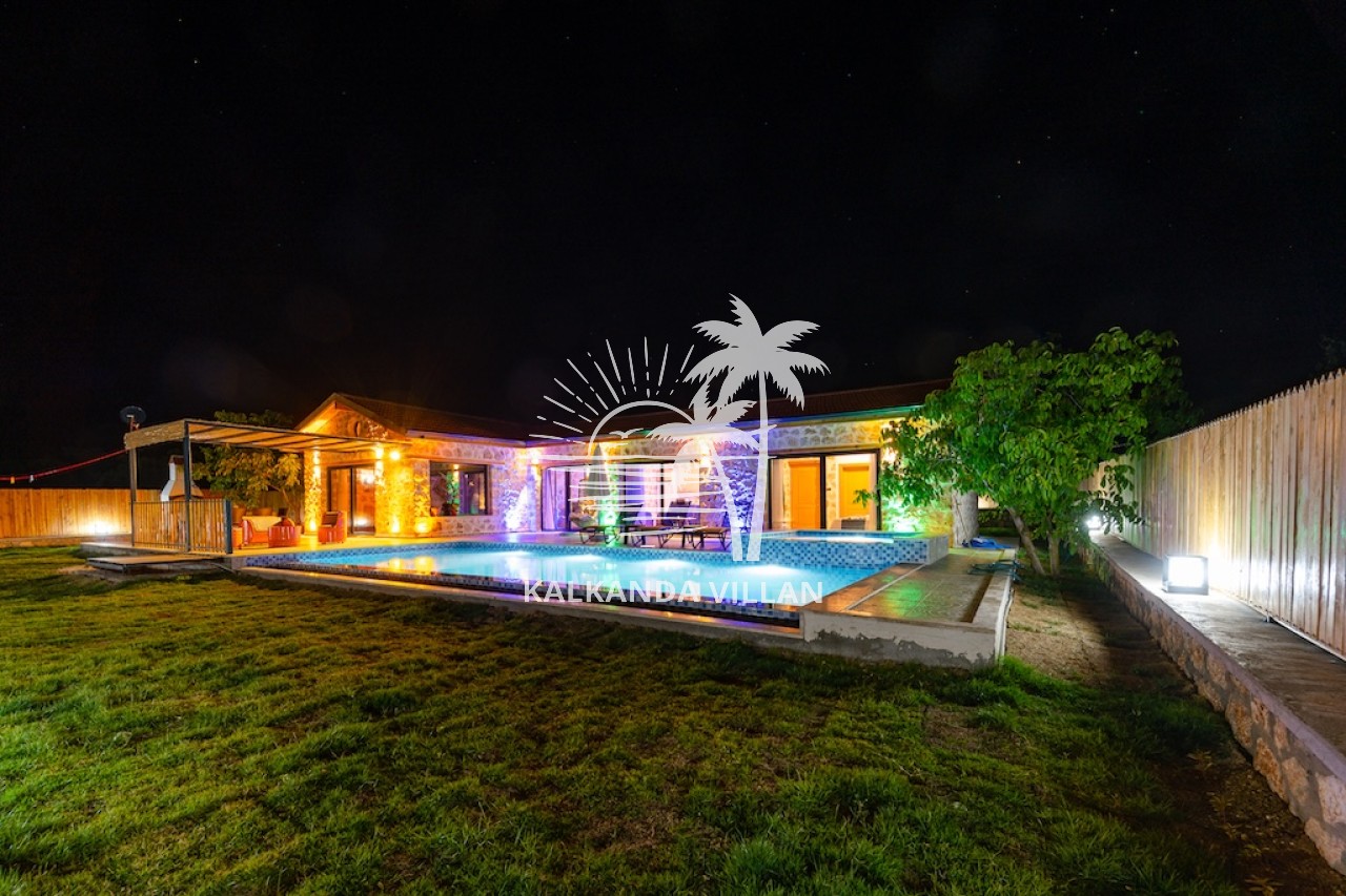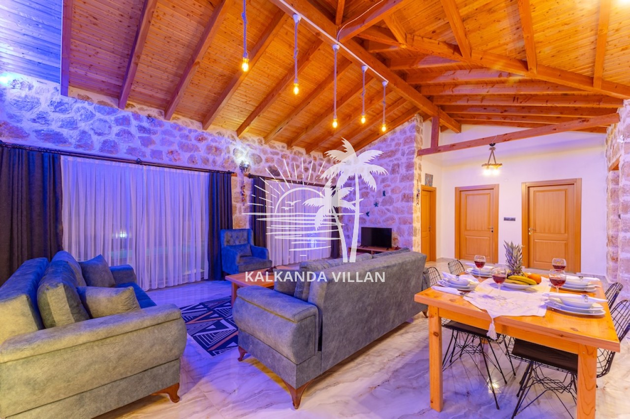 Die Villa Cevizici ist eine geräumige und komfortable Ferienvilla in Sarıbelen, einem beliebten Ferienort in Kalkan, Antalya, inmitten herrlicher Natur. Die Villa besticht durch ihre Architektur aus Stein und Holz und bietet mit ihrer modernen Einrichtung und der ruhigen Atmosphäre unvergessliche Urlaubsmomente. Sie verfügt über zwei Schlafzimmer und zwei Badezimmer und bietet Platz für bis zu vier Personen – ideal für kleine Familien oder Freundesgruppen. Genießen Sie die Natur im Freien mit privatem Pool, separatem Kinderbecken, Poolterrasse und Sonnenliegebereich. Die moderne amerikanische Küche und das großzügige Wohnzimmer der Villa Cevizici sorgen für ein komfortables Ambiente. Der private Poolbereich, die Grillmöglichkeiten und der Blick in die Natur schaffen die perfekte Kulisse für einen erholsamen Urlaub. Die Villa Cevizici ist die ideale Wahl für alle, die eine Ferienvilla in Kalkan Sarıbelen suchen und Natur, Privatsphäre und Komfort in einem genießen möchten.