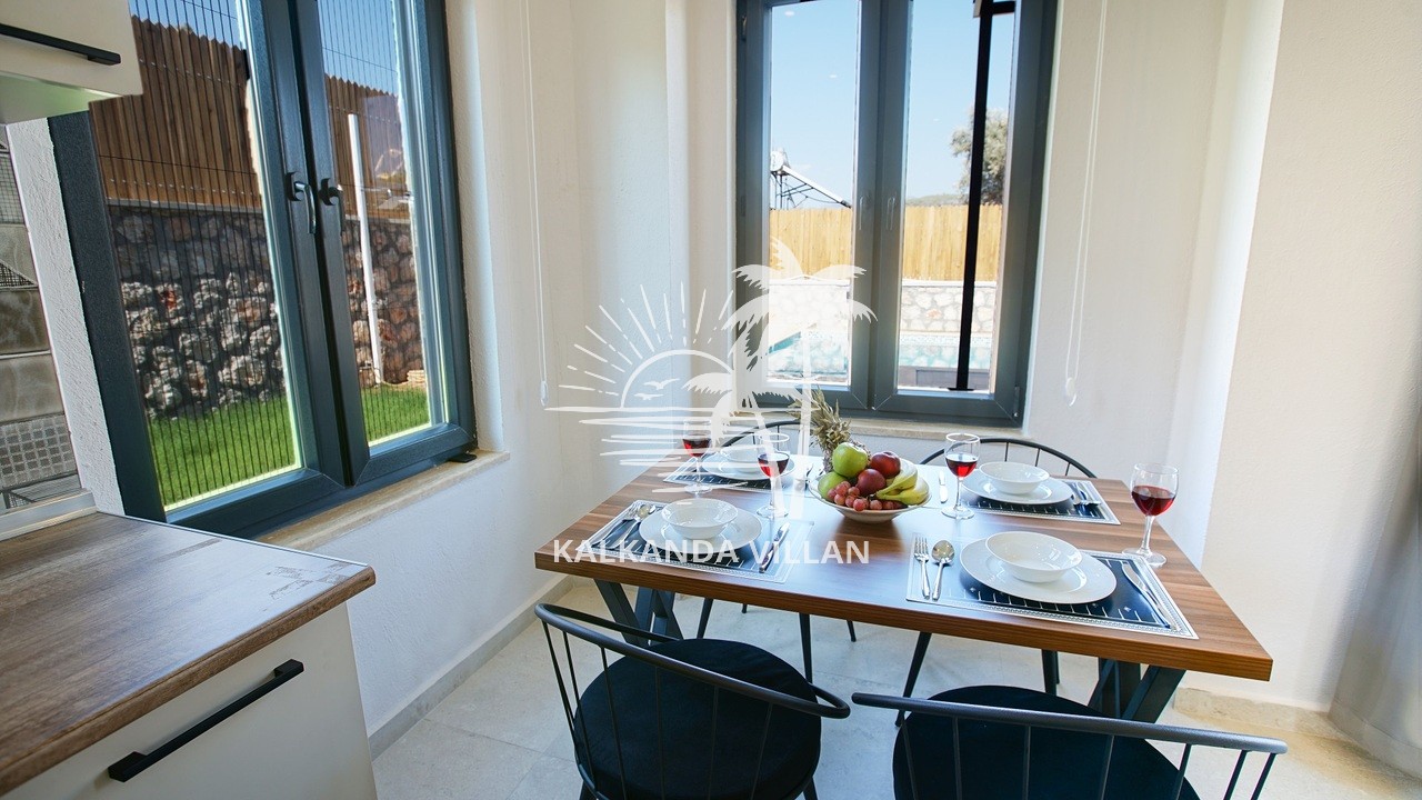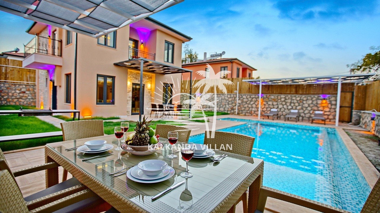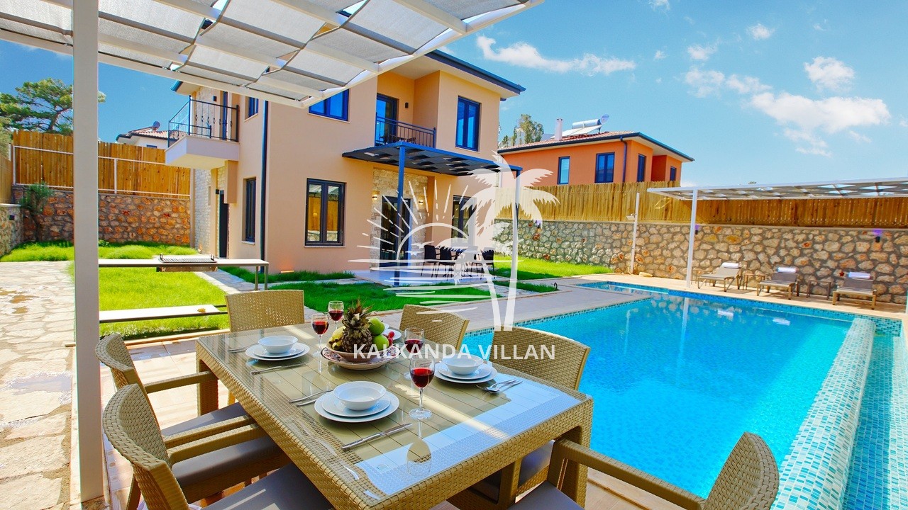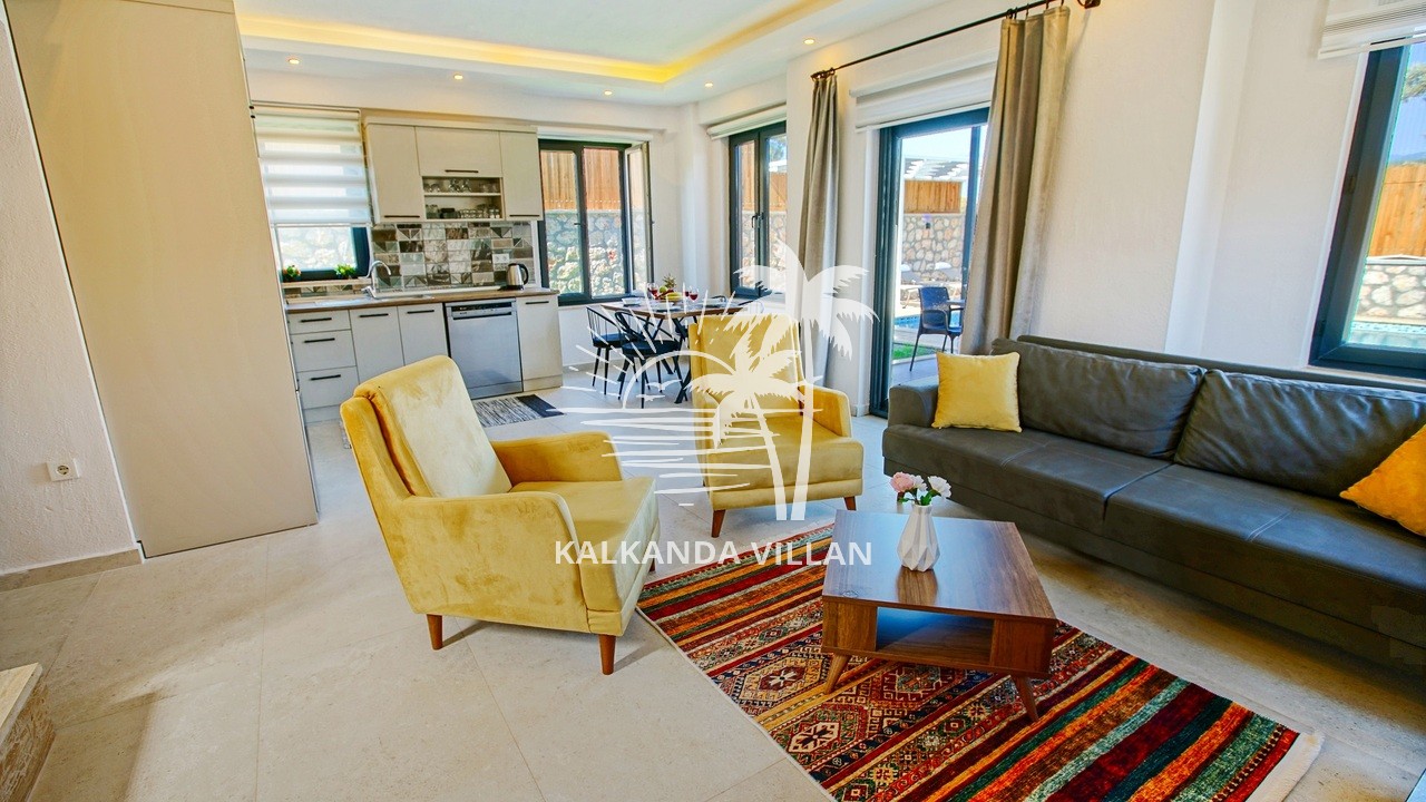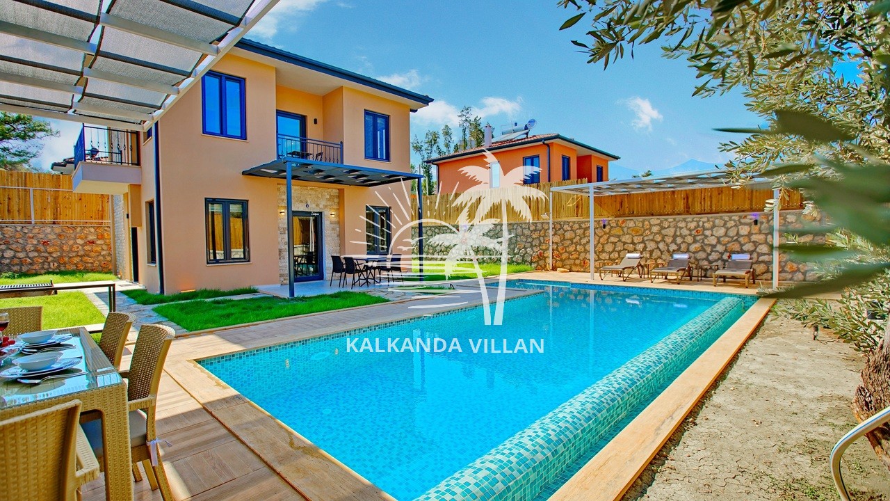 It offers a complete accommodation experience with its spacious garden area, private swimming pool, airy living spaces, and fully equipped kitchen. Its proximity to Patara Beach provides a combination of nature, sea, and tranquility.