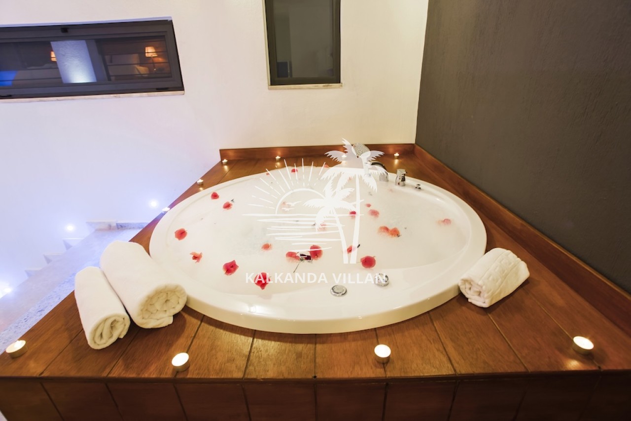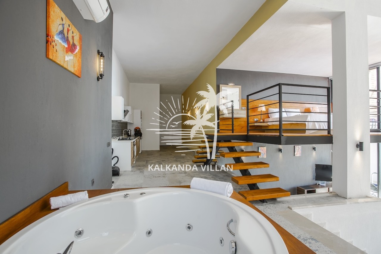 1. Bedroom: Double bed, bedside table, dressing table, air conditioning, jacuzzi, bathroom, and toilet.
