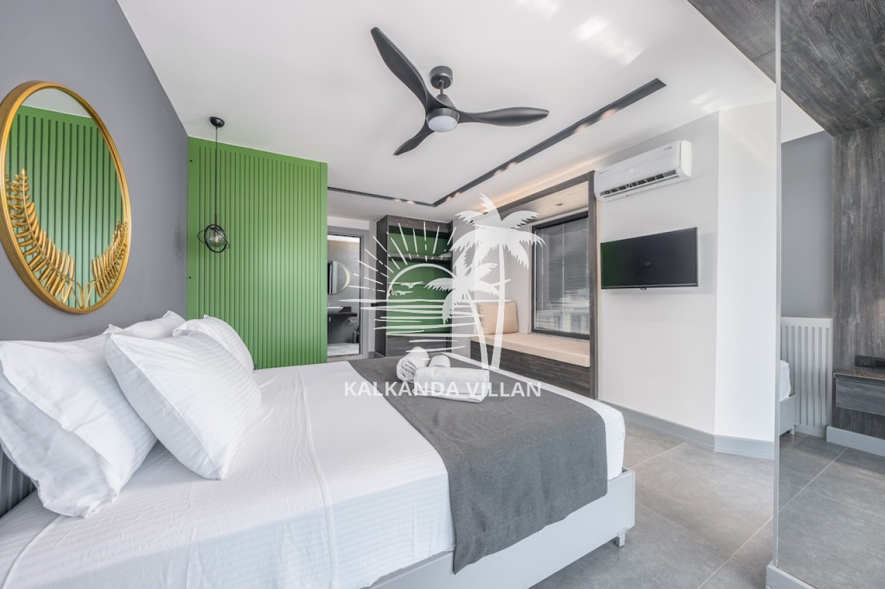 1. Yatak Odası : Çift kişilik yatak, Elbise dolabı, Komodin, Makyaj masası, Klima, Jakuzi, Banyo, ve tuvalet bulunmaktadır.