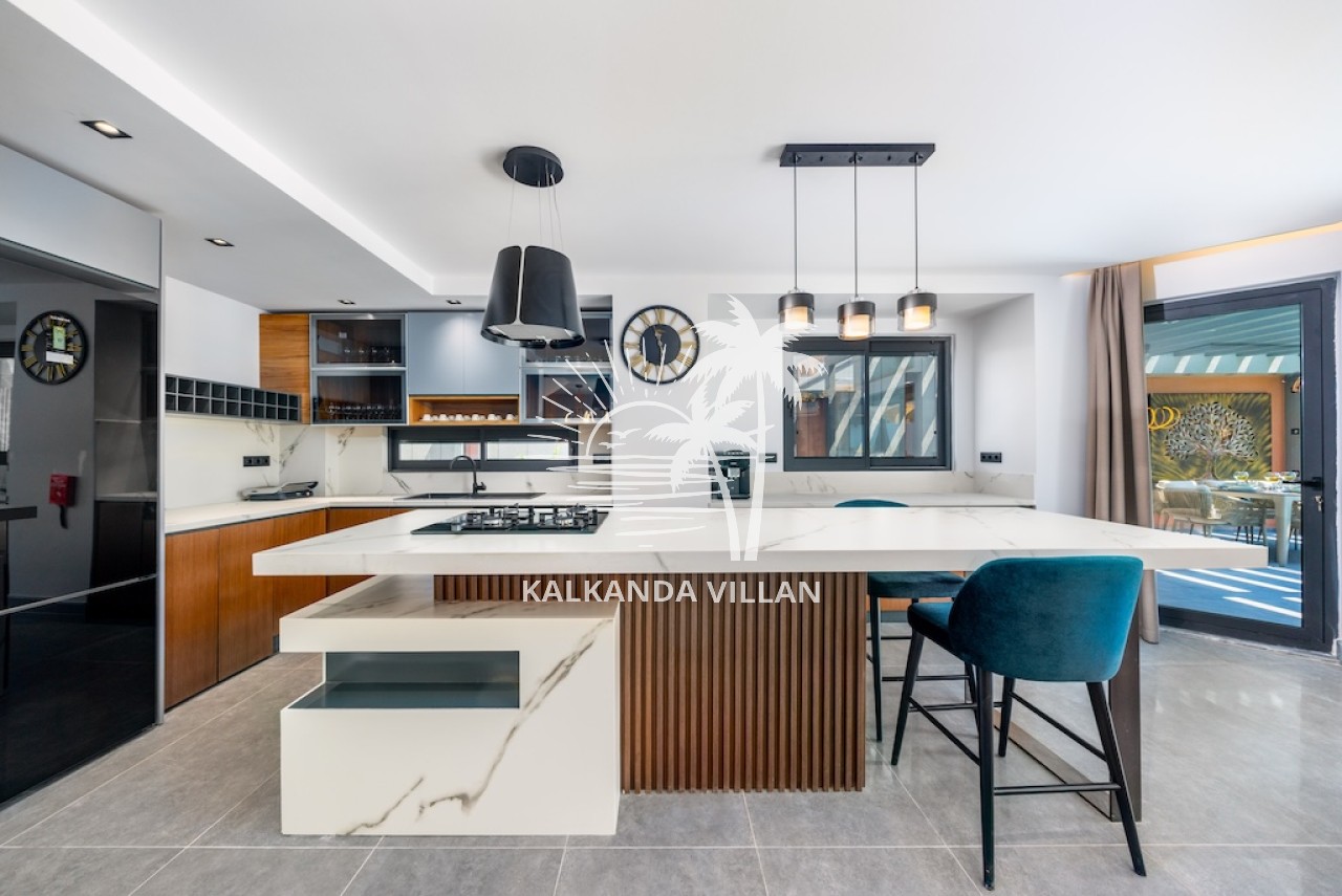 Mutfak : Modern Amerikan mutfak içerisinde buzdolabı, bulaşık makinesi, fırın, ocak, mikrodalga fırın, tost makinesi, yemek masası, 8 kişilik yemek takımları, çatal ve bıçak takımları, tencere ve tava takımları, bardaklar bulunmaktadır.
