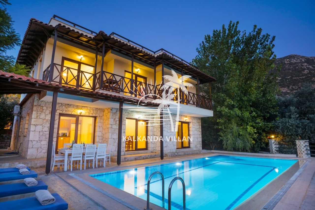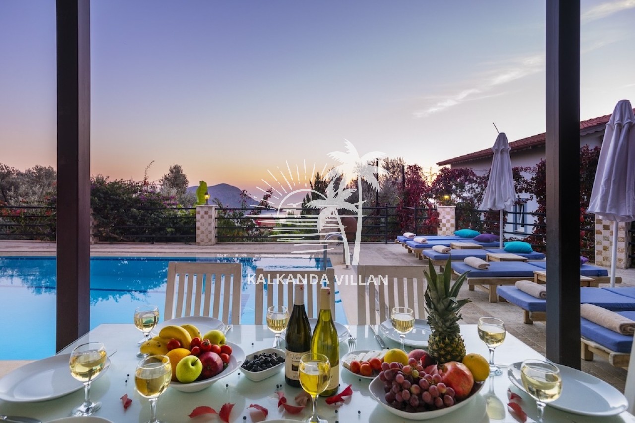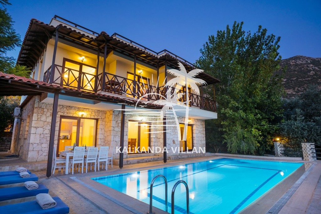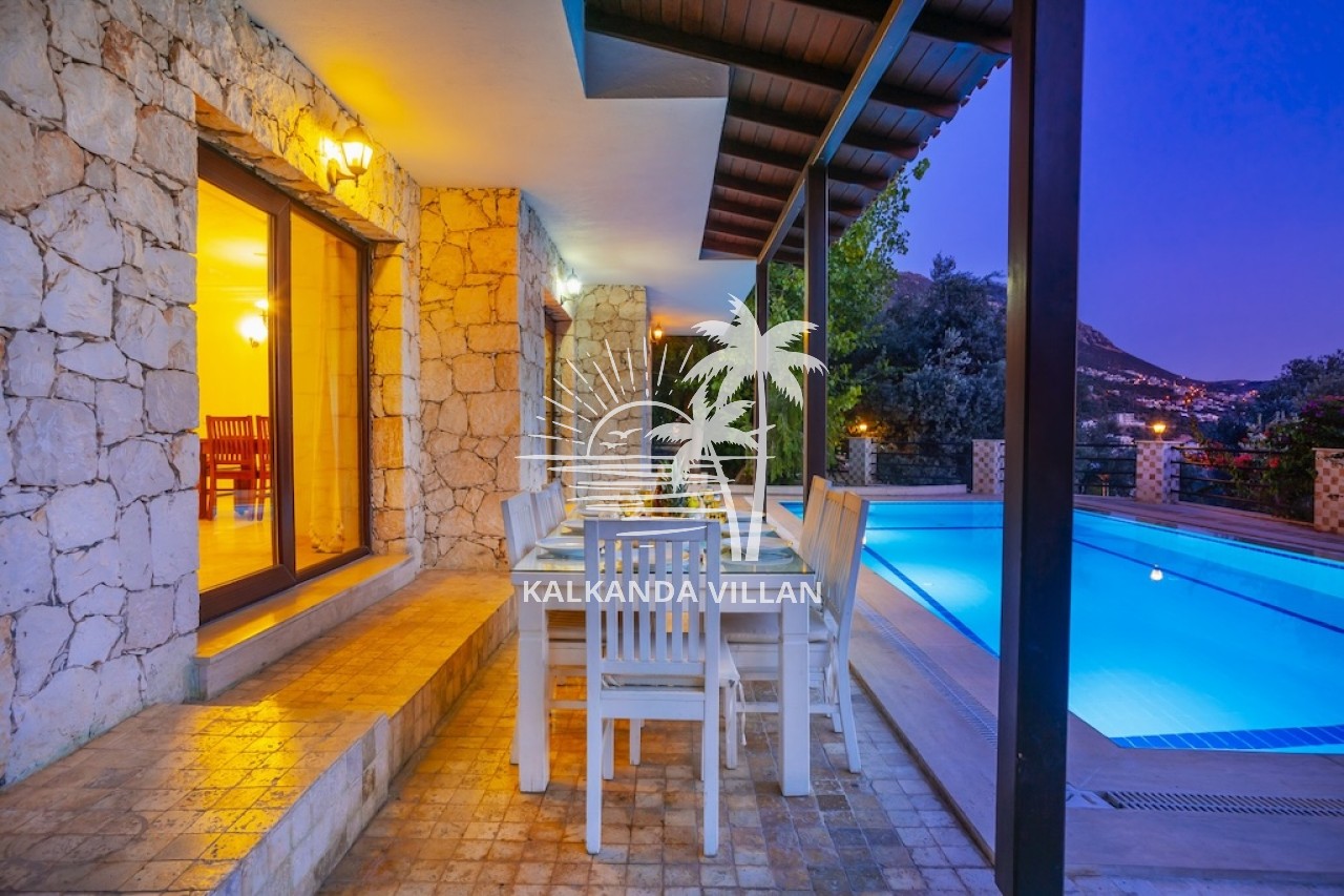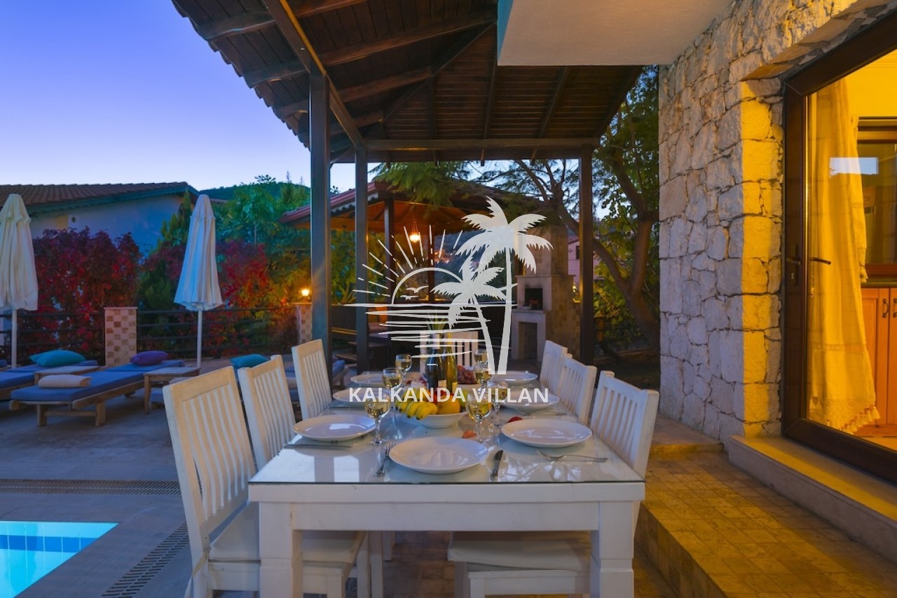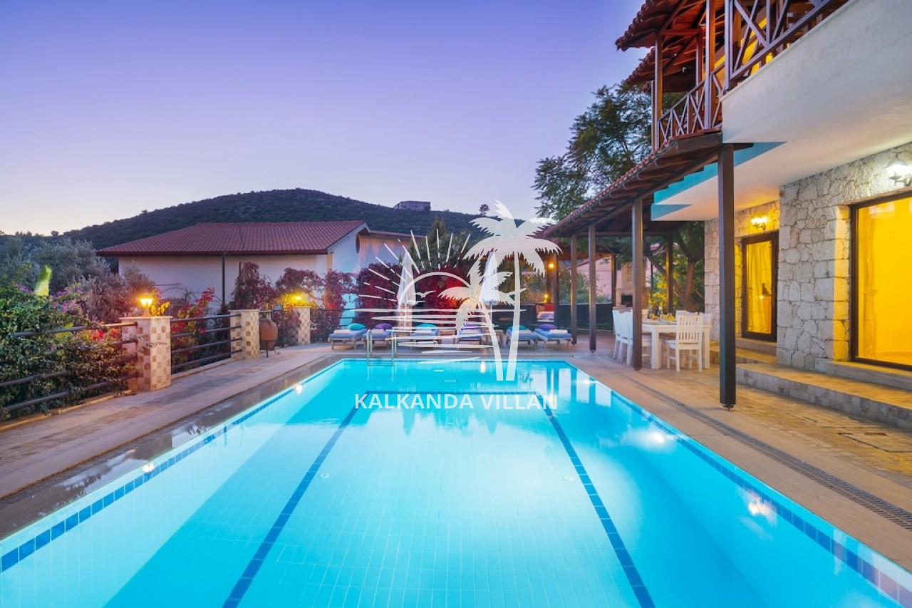Villa Otantik’in geniş terasında özel yüzme havuzu, barbekü (BBQ) alanı, açık oturma bölümleri ve panoramik deniz manzaralı balkonlar yer alır. Akdeniz’in muhteşem manzarası eşliğinde gün batımını izlemek, sevdiklerinizle keyifli akşam yemekleri paylaşmak için mükemmel bir ortam sunar. Bu özellikler, villayı Kalkan’da deniz manzaralı kiralık villa arayanlar için cazip bir tercih haline getirir.