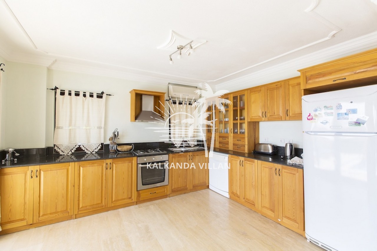 Mutfak : Modern Amerikan mutfak içerisinde buzdolabı, bulaşık makinesi, fırın, ocak, mikrodalga fırın, tost makinesi, yemek masası, 12 kişilik yemek takımları, çatal ve bıçak takımları, tencere ve tava takımları, bardaklar bulunmaktadır.
