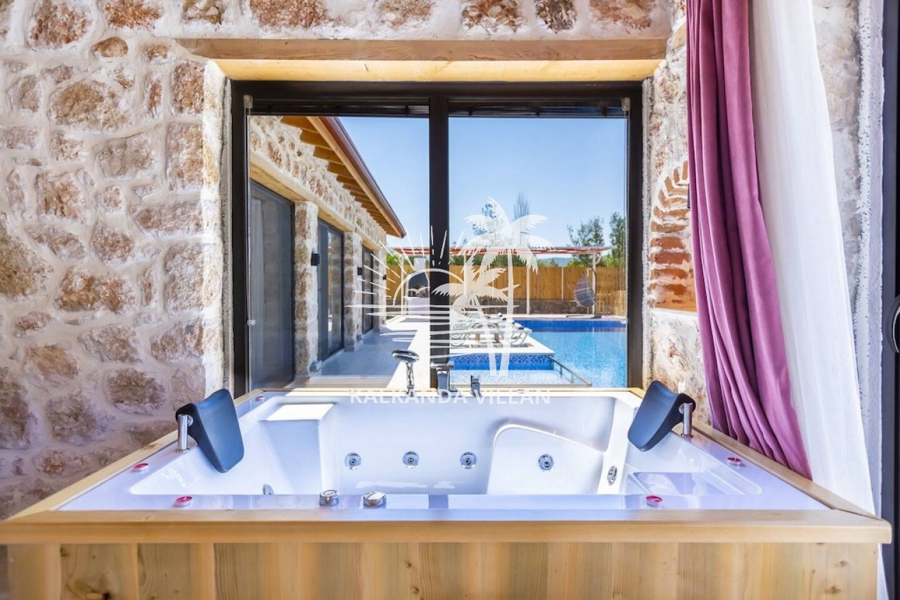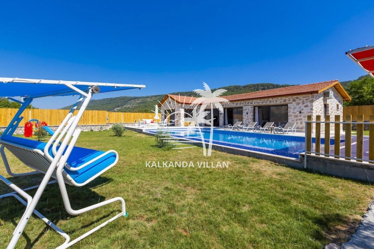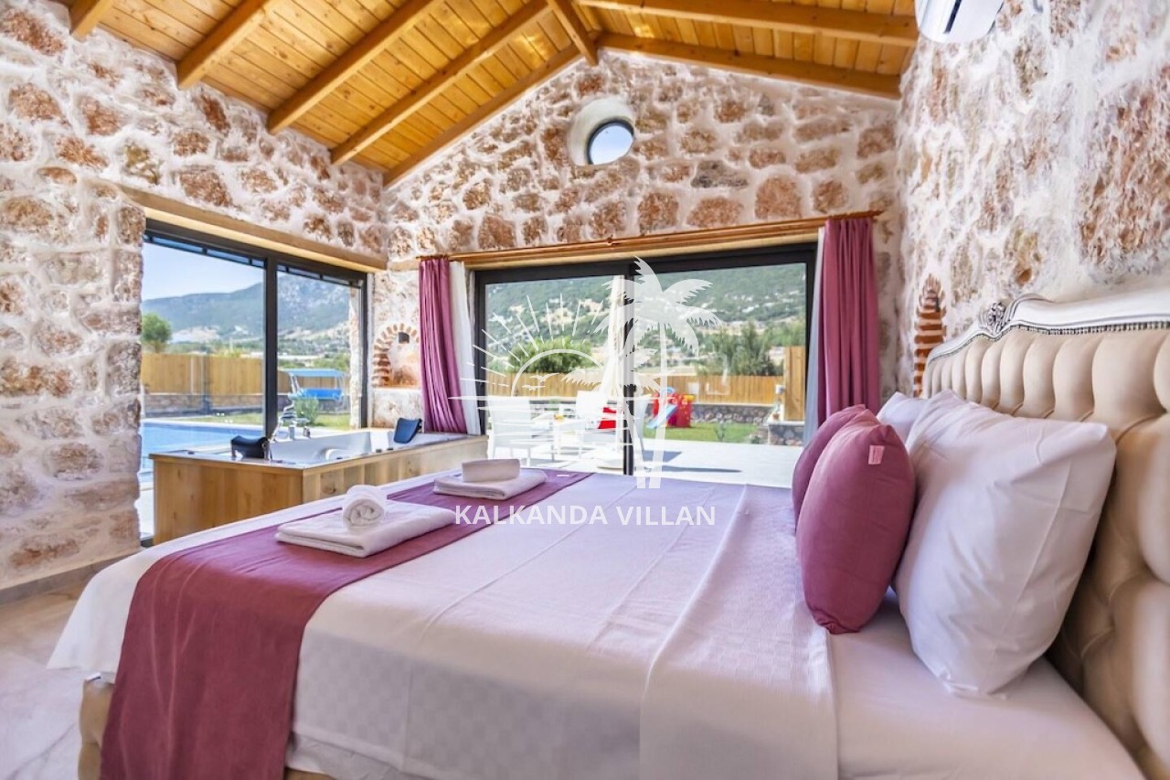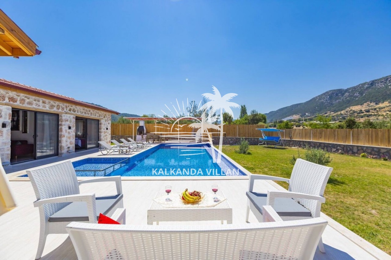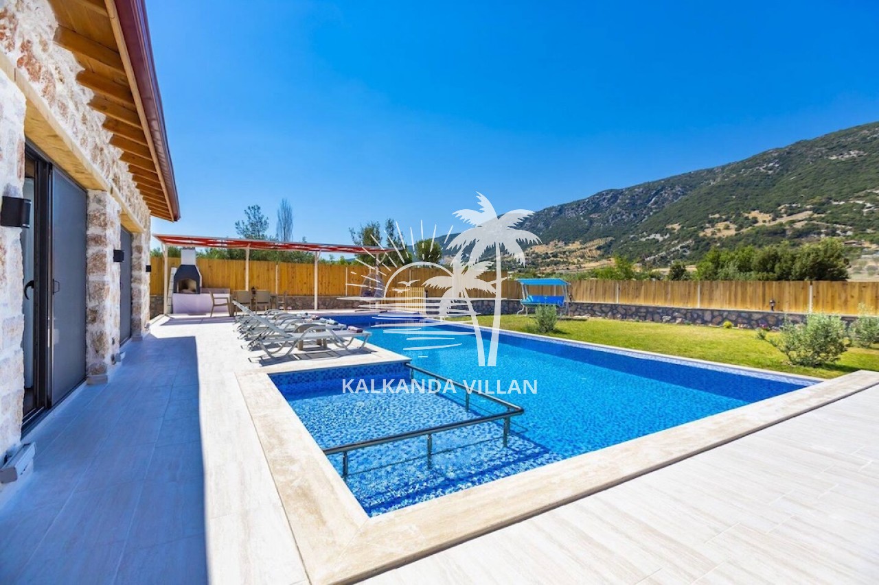 Villa Saye, Kalkan’ın huzurlu Sarıbelen bölgesinde konumlanan, doğayla iç içe ve konforlu bir kiralık villa seçeneğidir. Taş ve ahşap mimarisiyle dikkat çeken villa, modern dekorasyonuyla tatil boyunca ferah bir yaşam alanı sunar. Villa Saye toplam 2 yatak odası ve 2 banyo ile 4 kişiye kadar konaklama imkânı sağlar. İç mekândaki çift kişilik yatak odasında jakuzi gibi özel dokunuşlar, romantik ve rahat bir tatil deneyimi için tasarlanmıştır. Geniş özel yüzme havuzu, korunaklı havuz terası, oturma grupları ve barbekü alanı, dış mekânda keyifli vakit geçirmenizi sağlar. Bahçe ve havuz çevresi doğa manzaralı olarak tasarlanmıştır; bu sayede hem dinlenme hem de eğlence imkânı sunar. Kalkan şehir merkezine ve plajlara kolay ulaşım imkânı sağlayan Villa Saye, Sarıbelen’de kiralık villa arayanlar için doğa, mahremiyet ve konforu bir arada sunan ideal bir tercihtir.