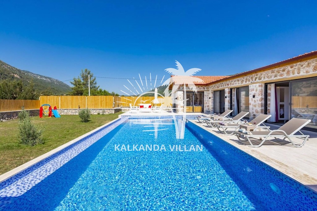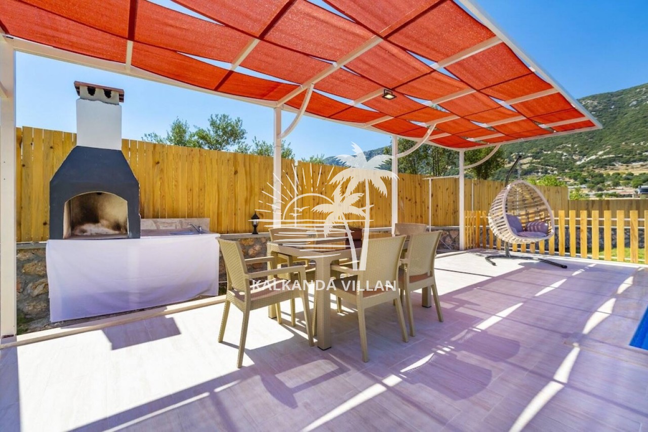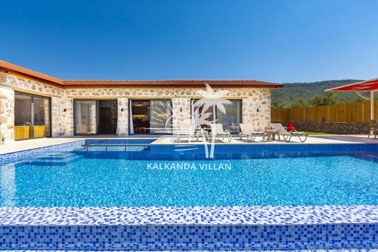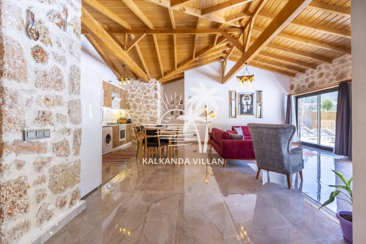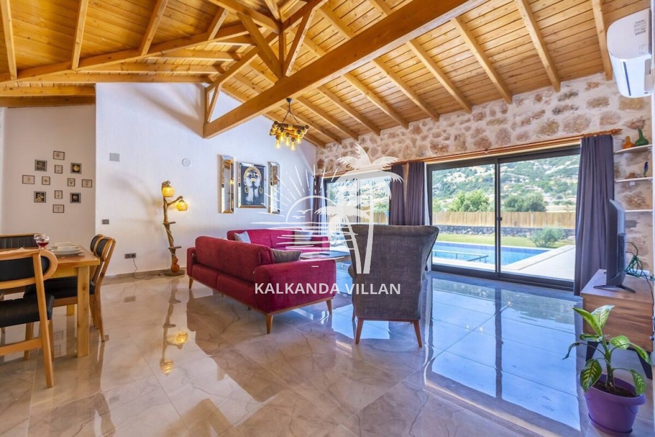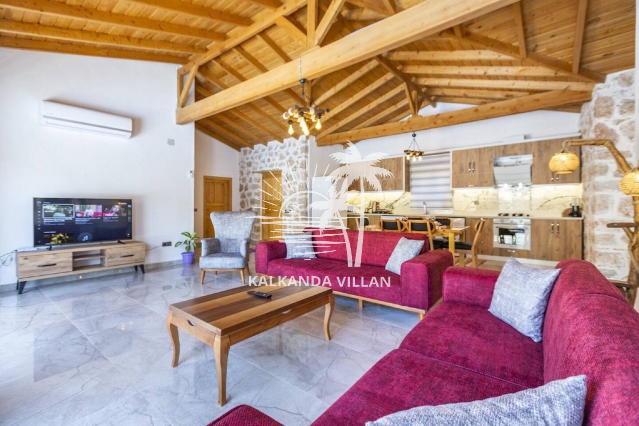 Villa Saye, Kalkan’ın huzurlu Sarıbelen bölgesinde konumlanan, doğayla iç içe ve konforlu bir kiralık villa seçeneğidir. Taş ve ahşap mimarisiyle dikkat çeken villa, modern dekorasyonuyla tatil boyunca ferah bir yaşam alanı sunar. Villa Saye toplam 2 yatak odası ve 2 banyo ile 4 kişiye kadar konaklama imkânı sağlar. İç mekândaki çift kişilik yatak odasında jakuzi gibi özel dokunuşlar, romantik ve rahat bir tatil deneyimi için tasarlanmıştır. Geniş özel yüzme havuzu, korunaklı havuz terası, oturma grupları ve barbekü alanı, dış mekânda keyifli vakit geçirmenizi sağlar. Bahçe ve havuz çevresi doğa manzaralı olarak tasarlanmıştır; bu sayede hem dinlenme hem de eğlence imkânı sunar. Kalkan şehir merkezine ve plajlara kolay ulaşım imkânı sağlayan Villa Saye, Sarıbelen’de kiralık villa arayanlar için doğa, mahremiyet ve konforu bir arada sunan ideal bir tercihtir.