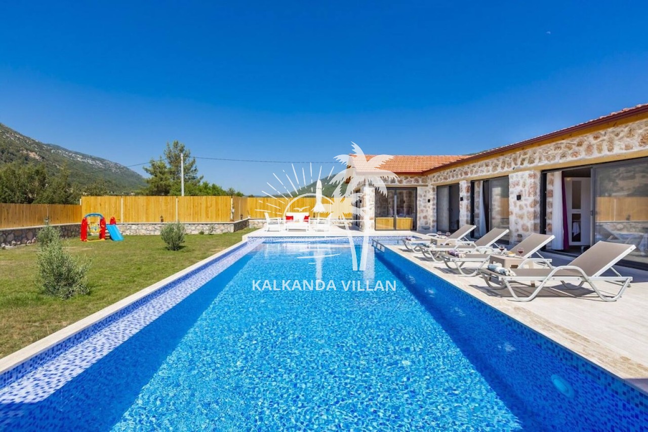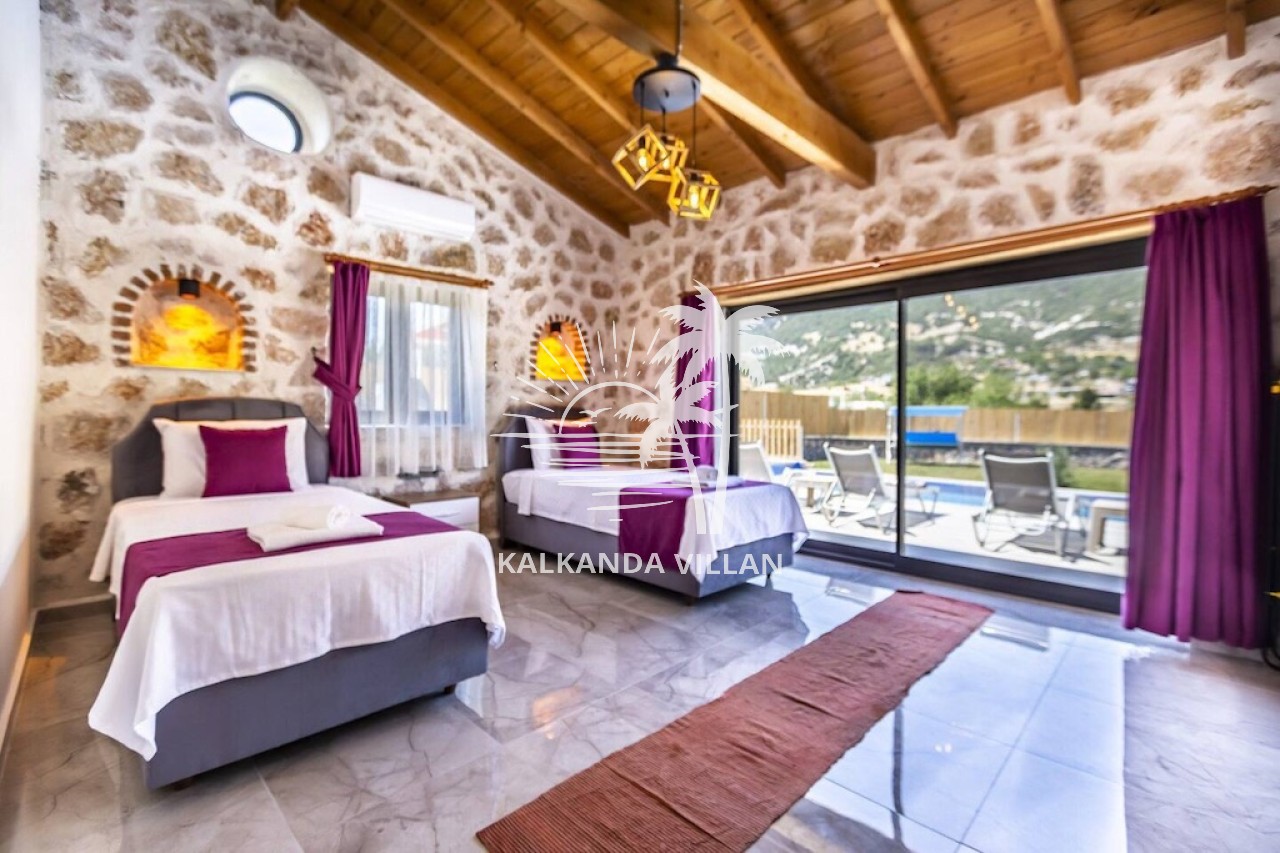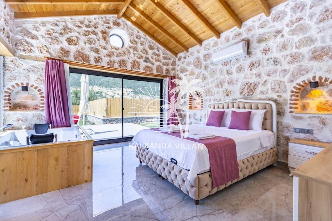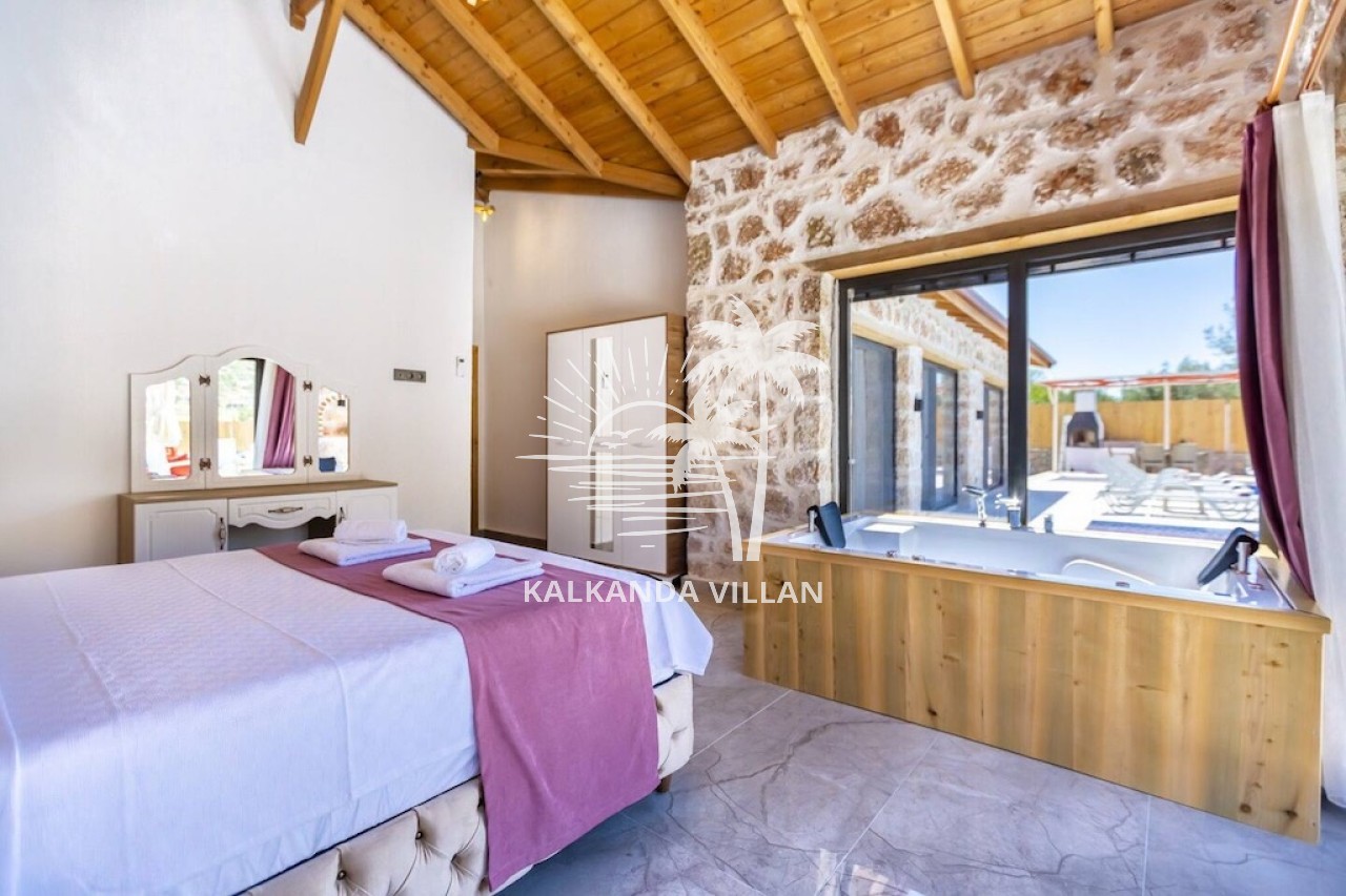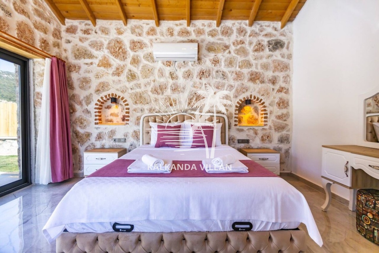 Villa Saye, Kalkan’ın huzurlu Sarıbelen bölgesinde konumlanan, doğayla iç içe ve konforlu bir kiralık villa seçeneğidir. Taş ve ahşap mimarisiyle dikkat çeken villa, modern dekorasyonuyla tatil boyunca ferah bir yaşam alanı sunar. Villa Saye toplam 2 yatak odası ve 2 banyo ile 4 kişiye kadar konaklama imkânı sağlar. İç mekândaki çift kişilik yatak odasında jakuzi gibi özel dokunuşlar, romantik ve rahat bir tatil deneyimi için tasarlanmıştır. Geniş özel yüzme havuzu, korunaklı havuz terası, oturma grupları ve barbekü alanı, dış mekânda keyifli vakit geçirmenizi sağlar. Bahçe ve havuz çevresi doğa manzaralı olarak tasarlanmıştır; bu sayede hem dinlenme hem de eğlence imkânı sunar. Kalkan şehir merkezine ve plajlara kolay ulaşım imkânı sağlayan Villa Saye, Sarıbelen’de kiralık villa arayanlar için doğa, mahremiyet ve konforu bir arada sunan ideal bir tercihtir.
