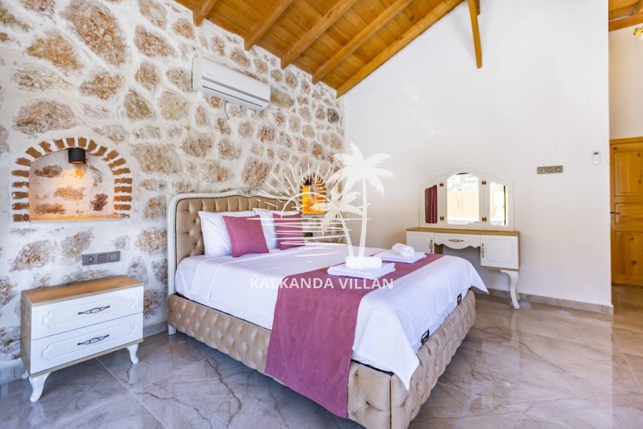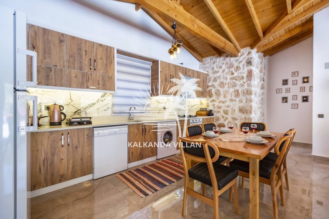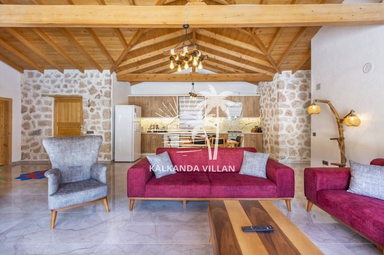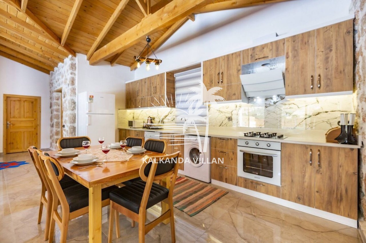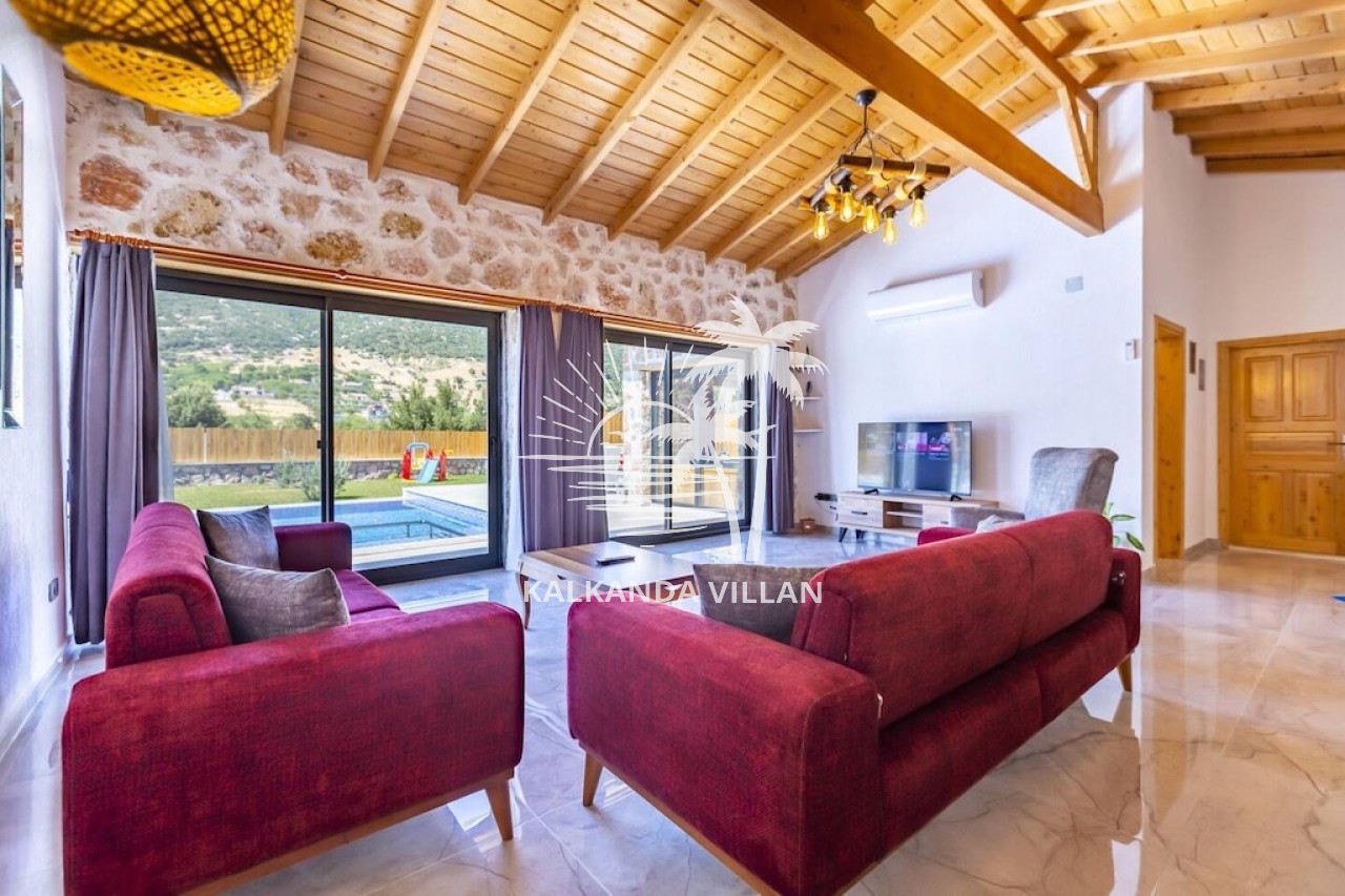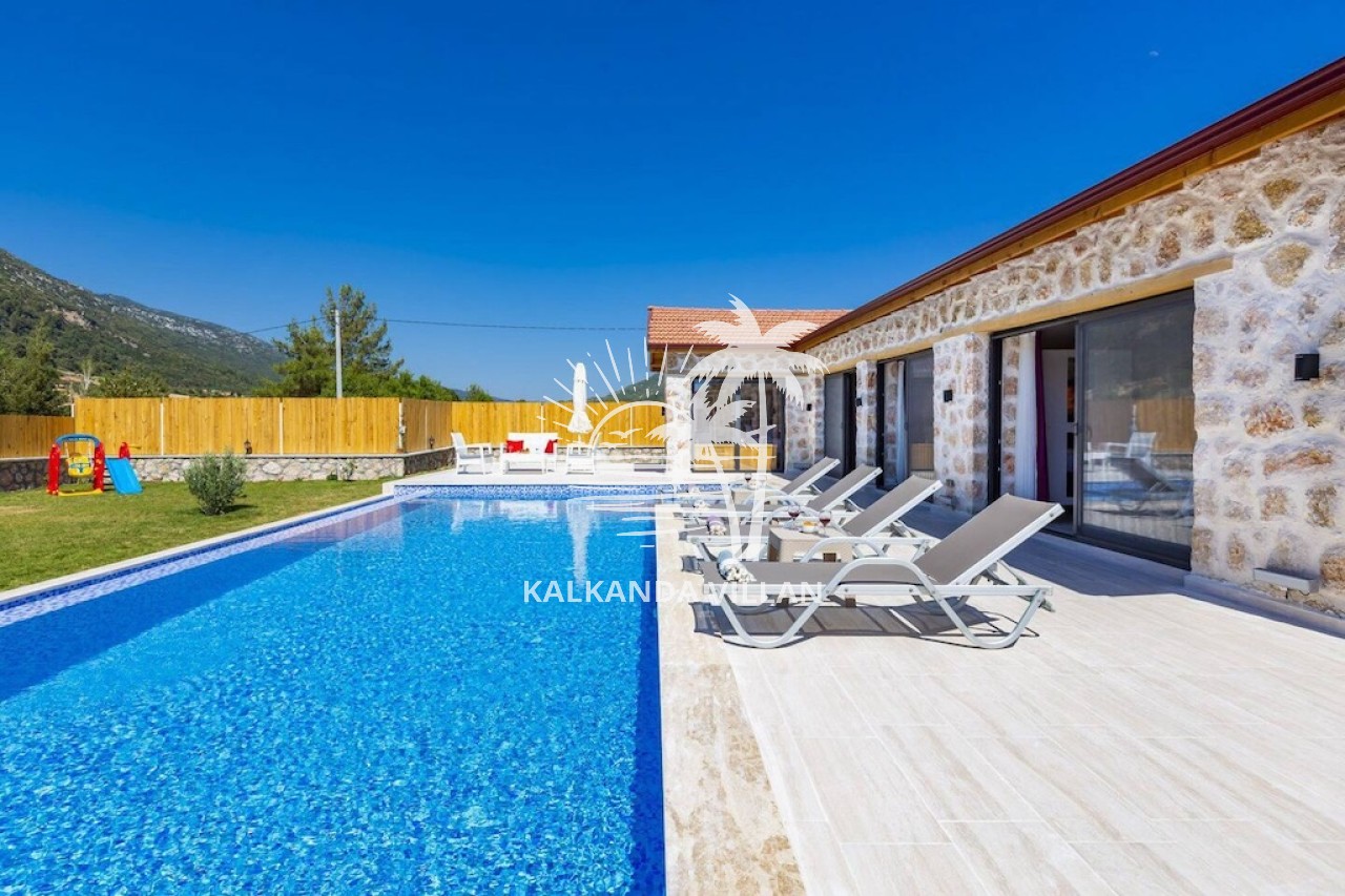 Villa Saye, Kalkan’ın huzurlu Sarıbelen bölgesinde konumlanan, doğayla iç içe ve konforlu bir kiralık villa seçeneğidir. Taş ve ahşap mimarisiyle dikkat çeken villa, modern dekorasyonuyla tatil boyunca ferah bir yaşam alanı sunar. Villa Saye toplam 2 yatak odası ve 2 banyo ile 4 kişiye kadar konaklama imkânı sağlar. İç mekândaki çift kişilik yatak odasında jakuzi gibi özel dokunuşlar, romantik ve rahat bir tatil deneyimi için tasarlanmıştır. Geniş özel yüzme havuzu, korunaklı havuz terası, oturma grupları ve barbekü alanı, dış mekânda keyifli vakit geçirmenizi sağlar. Bahçe ve havuz çevresi doğa manzaralı olarak tasarlanmıştır; bu sayede hem dinlenme hem de eğlence imkânı sunar. Kalkan şehir merkezine ve plajlara kolay ulaşım imkânı sağlayan Villa Saye, Sarıbelen’de kiralık villa arayanlar için doğa, mahremiyet ve konforu bir arada sunan ideal bir tercihtir.