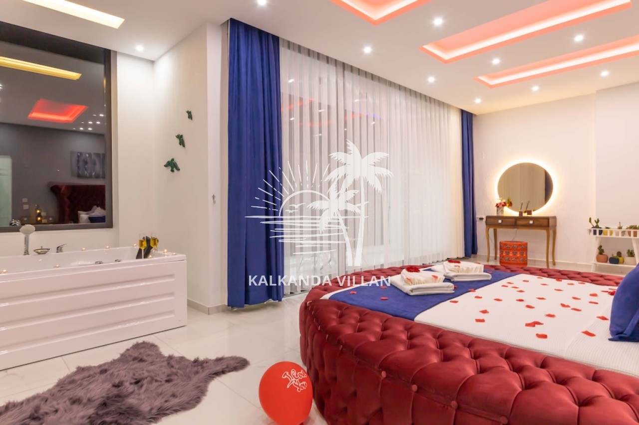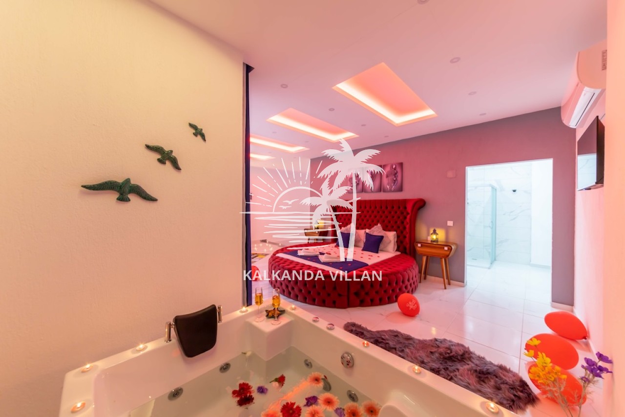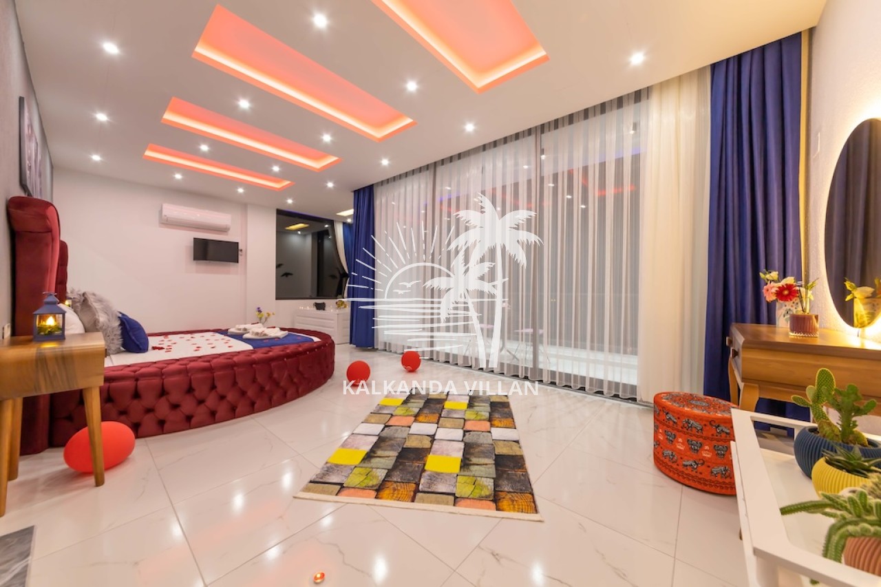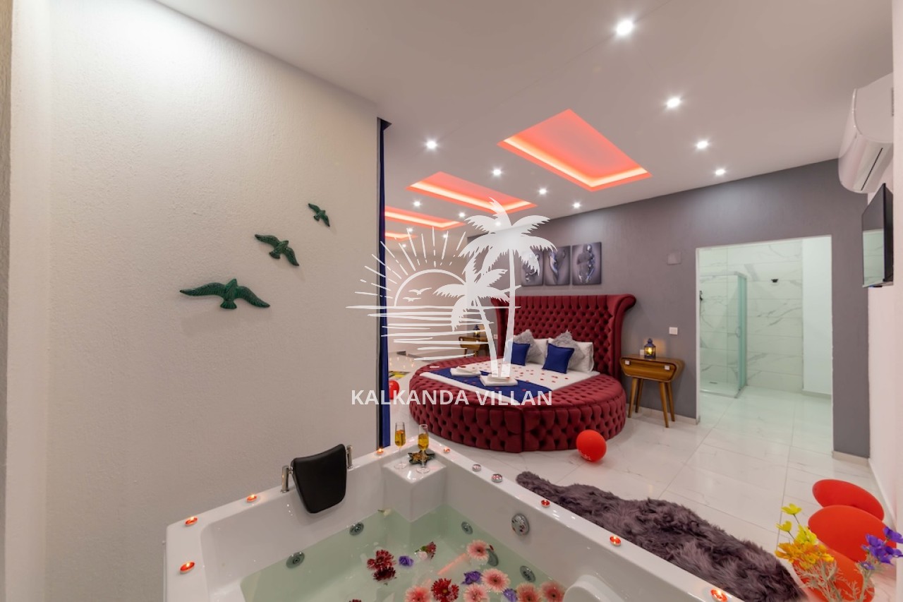 1. Yatak Odası : Çift kişilik yatak, Elbise dolabı, Komodin, Makyaj masası, Klima, Tv, Jakuzi, Banyo, ve tuvalet bulunmaktadır.