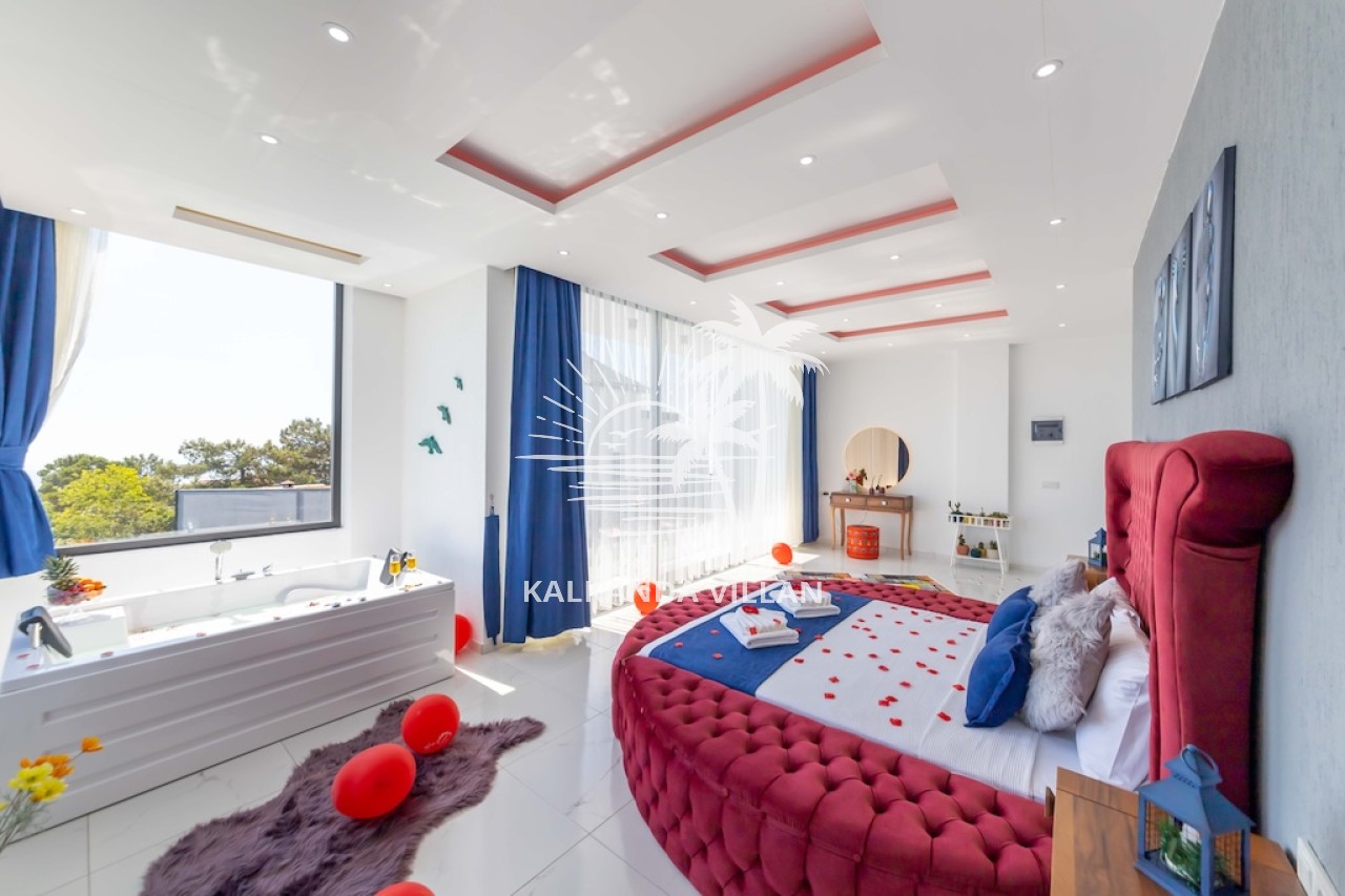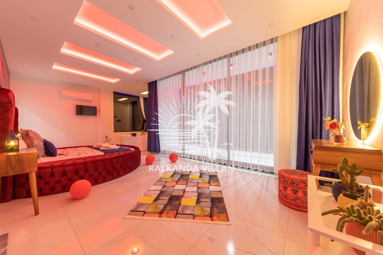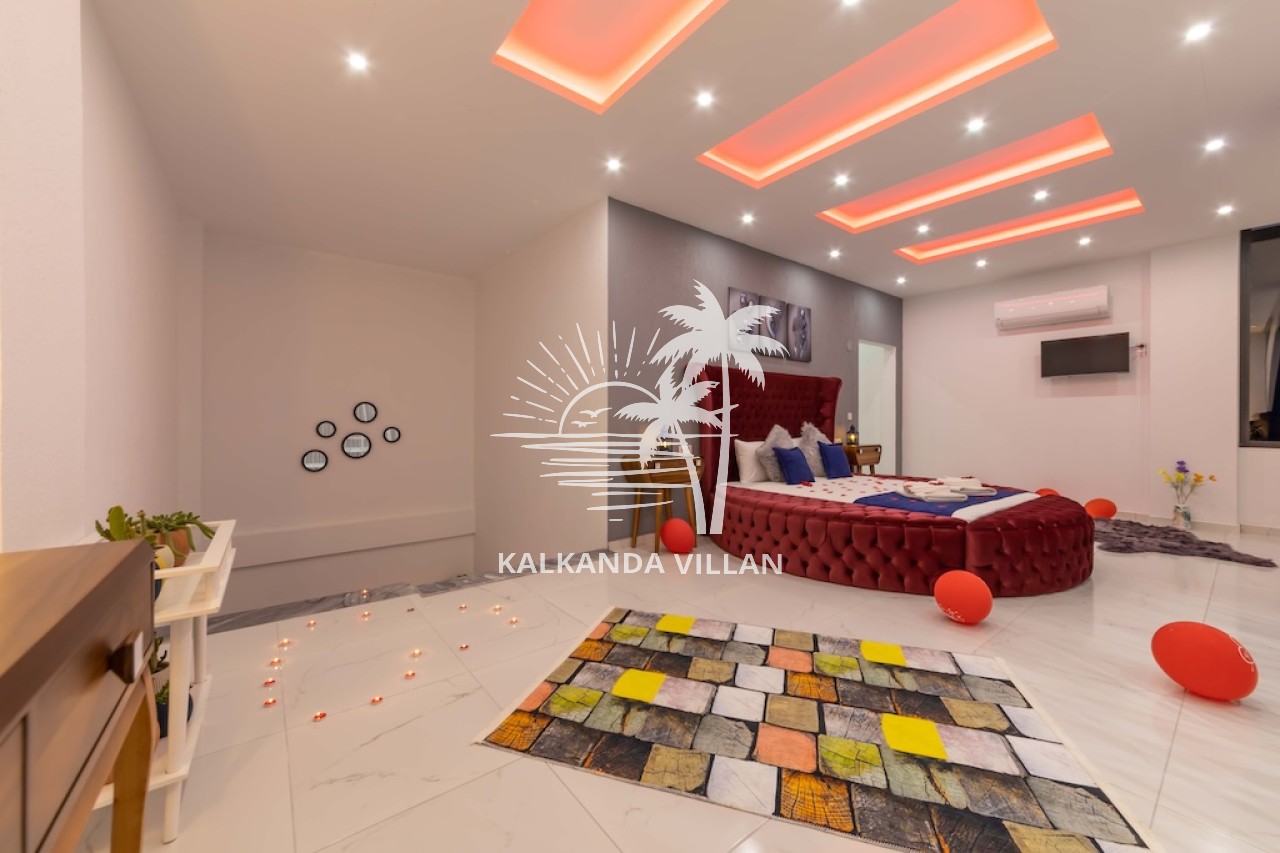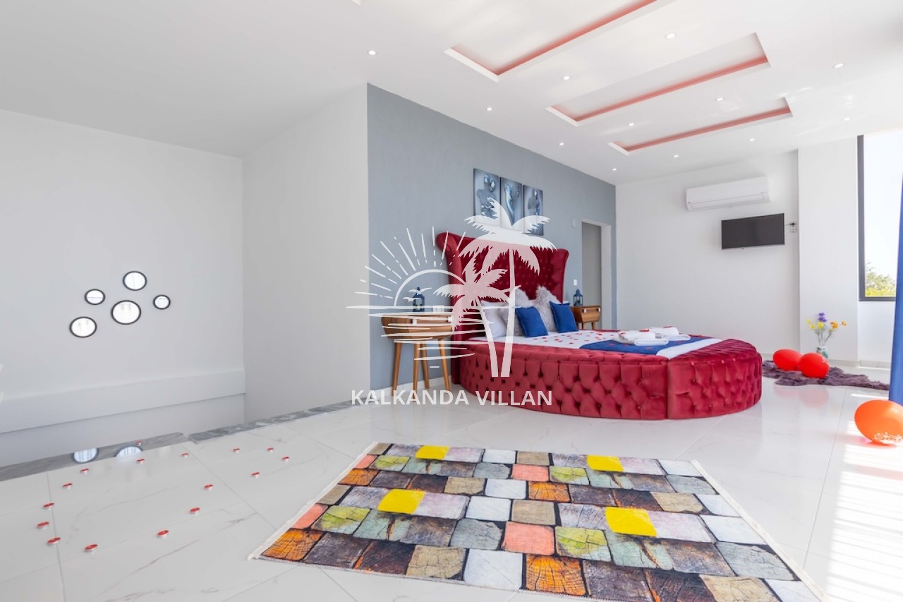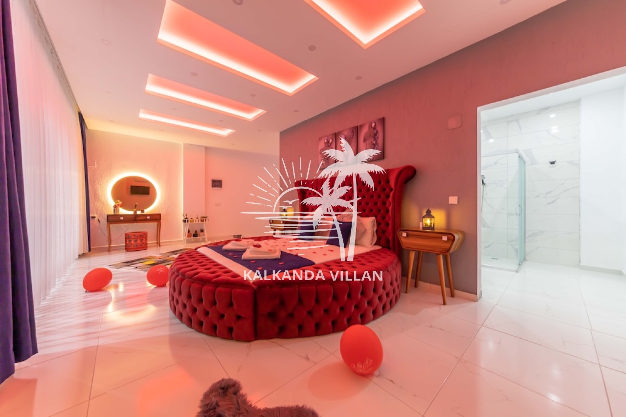 1. Yatak Odası : Çift kişilik yatak, Elbise dolabı, Komodin, Makyaj masası, Klima, Tv, Jakuzi, Banyo, ve tuvalet bulunmaktadır.