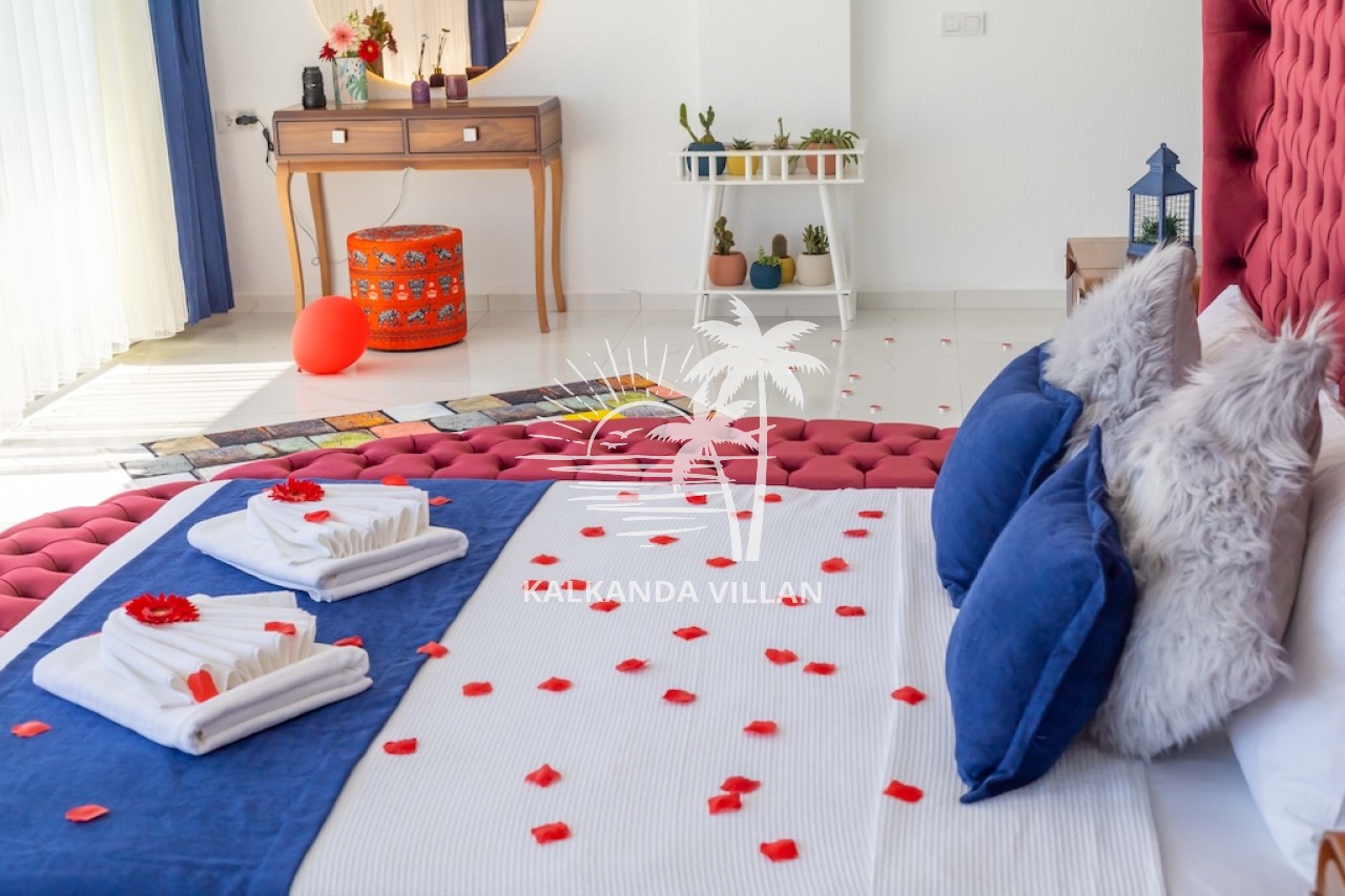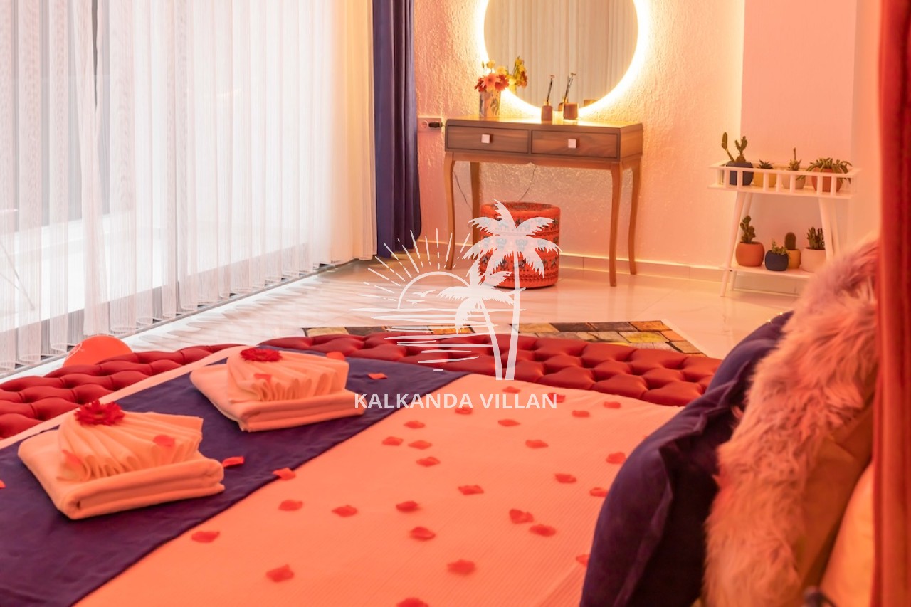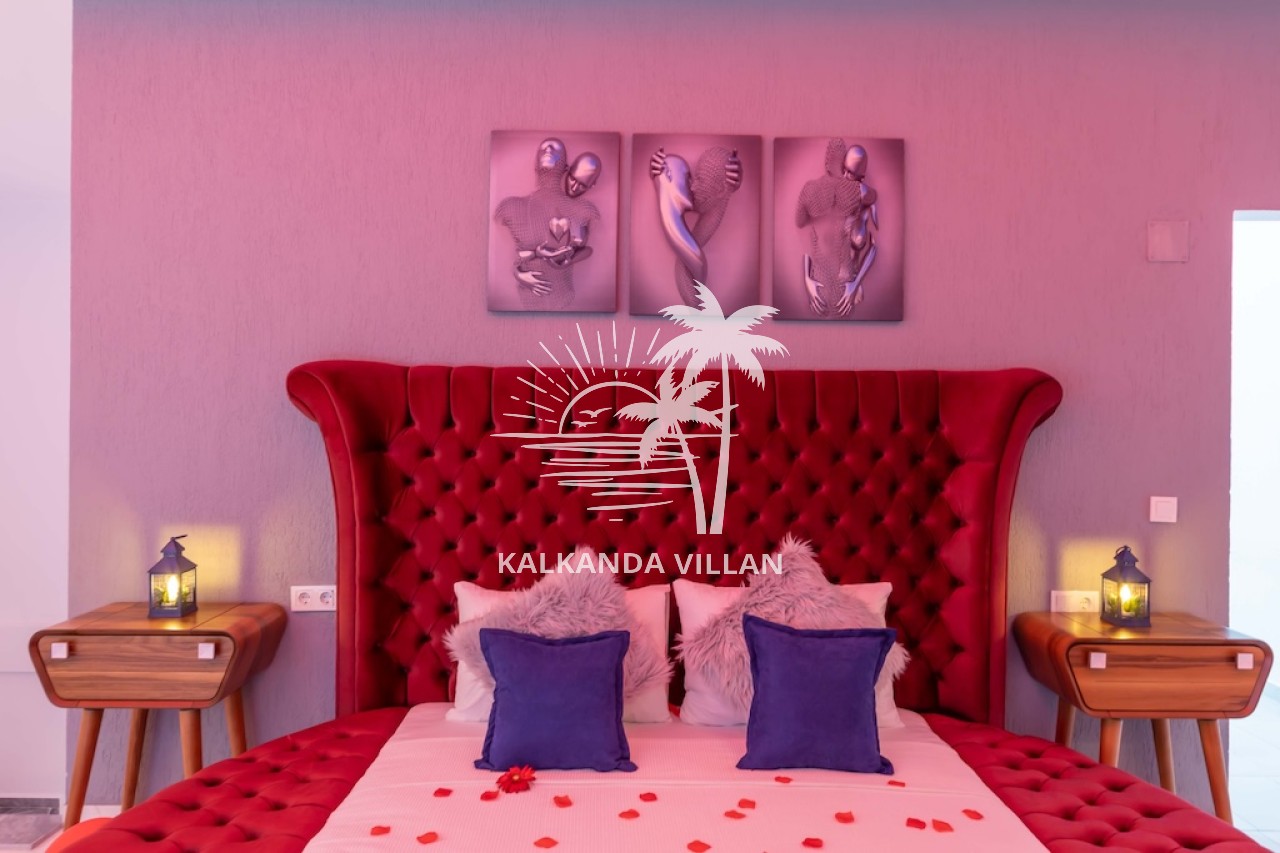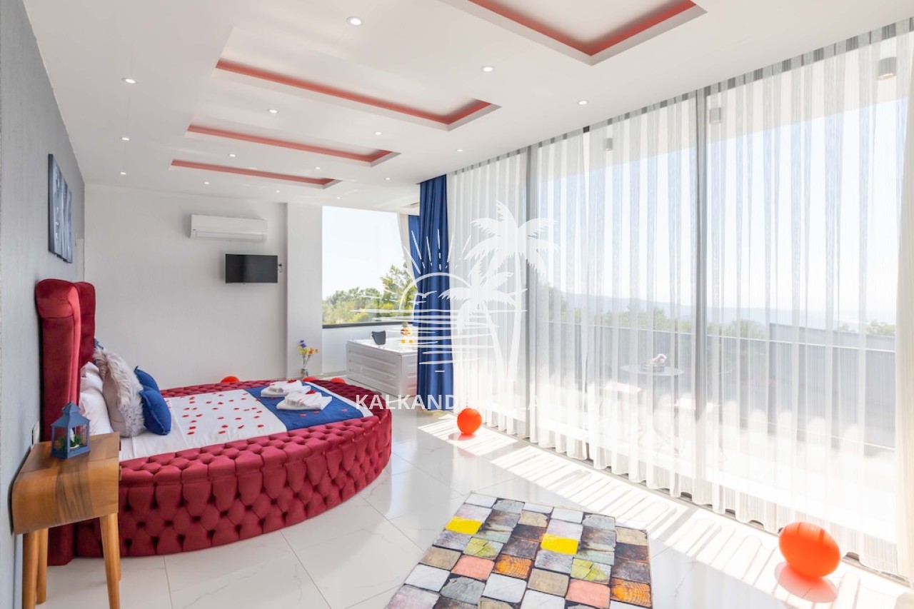 1. Yatak Odası : Çift kişilik yatak, Elbise dolabı, Komodin, Makyaj masası, Klima, Tv, Jakuzi, Banyo, ve tuvalet bulunmaktadır.