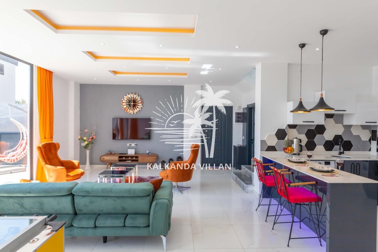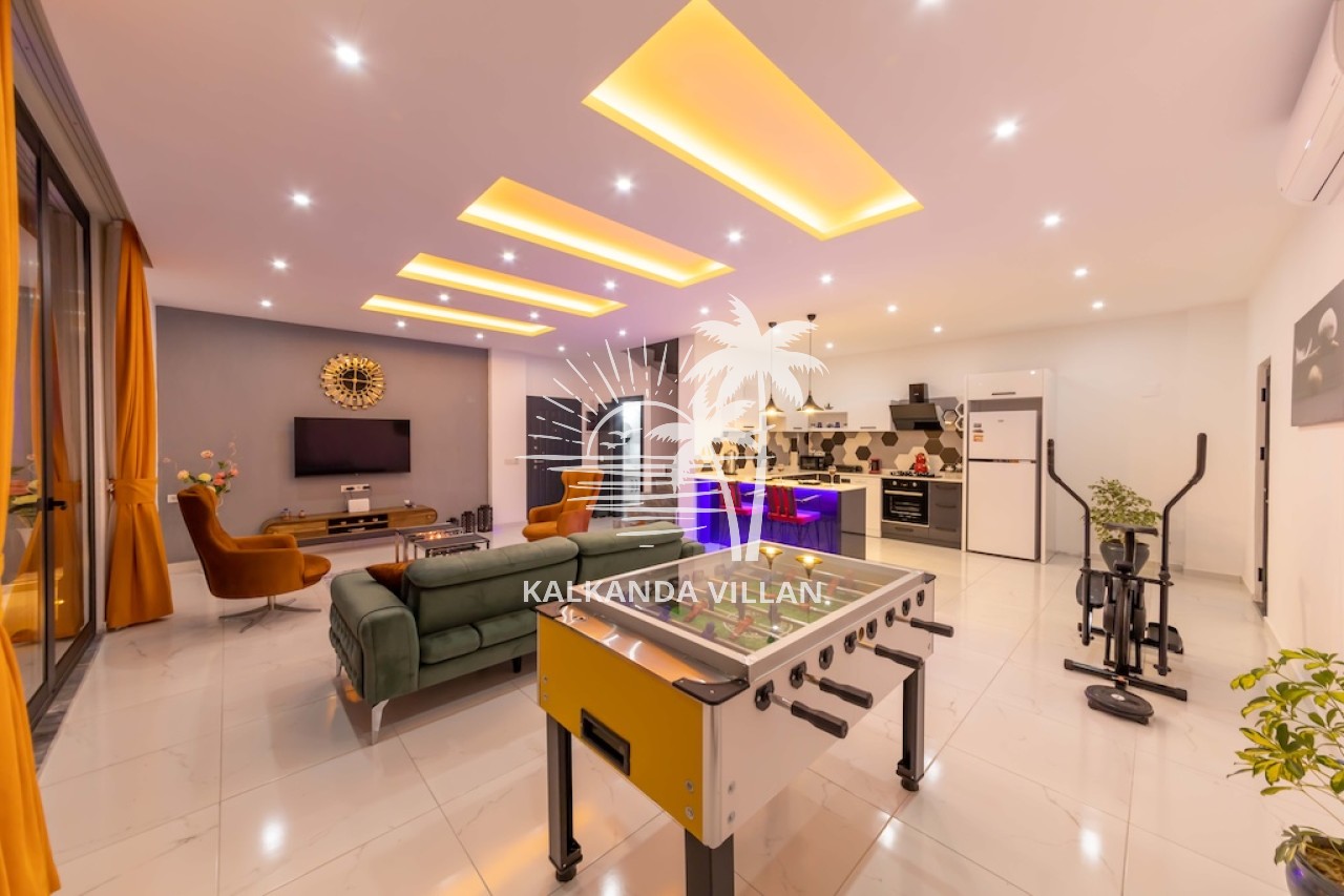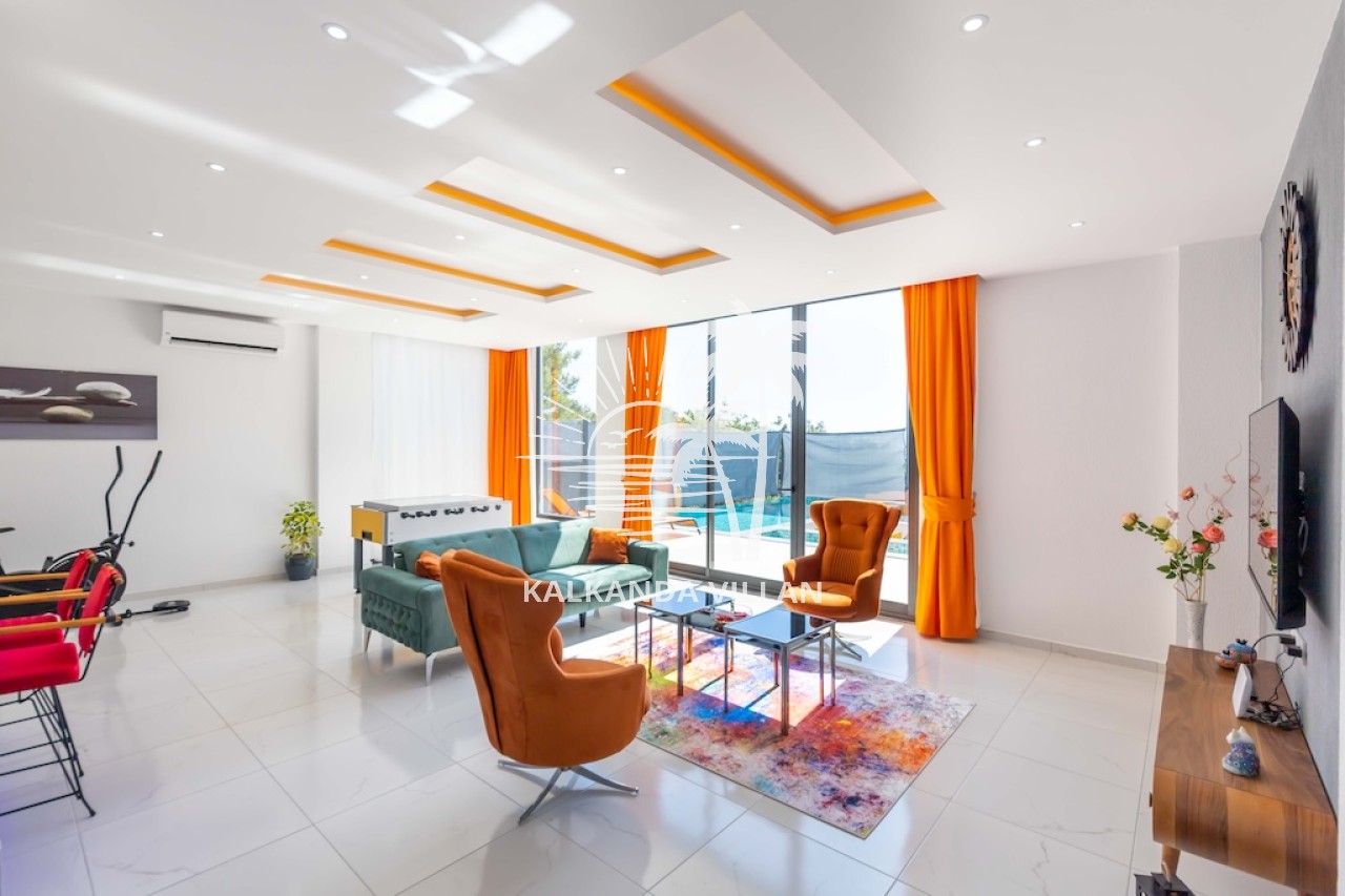Salon : Salon içerisinde oturma grubu, TV, klima, sehpa bulunmaktadır. Havuz terasına çıkış yapılabilmektedir.
