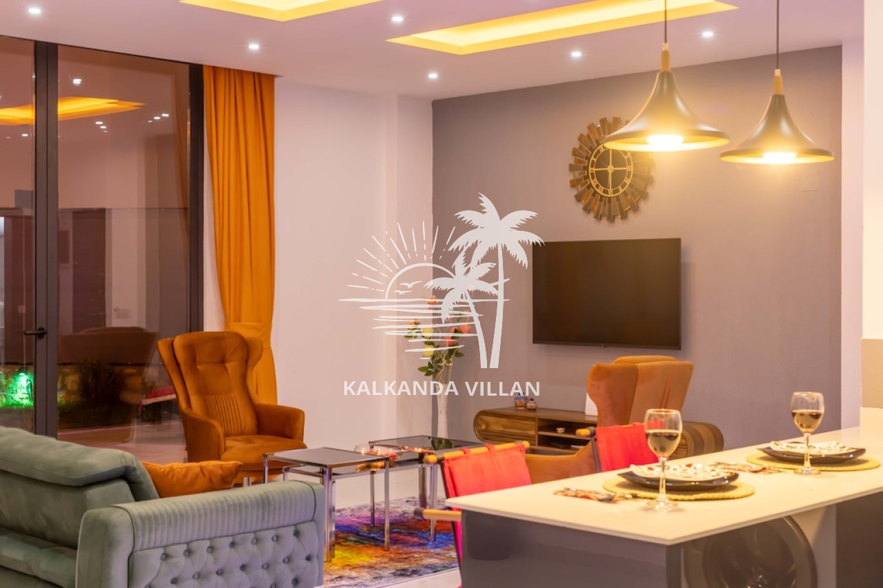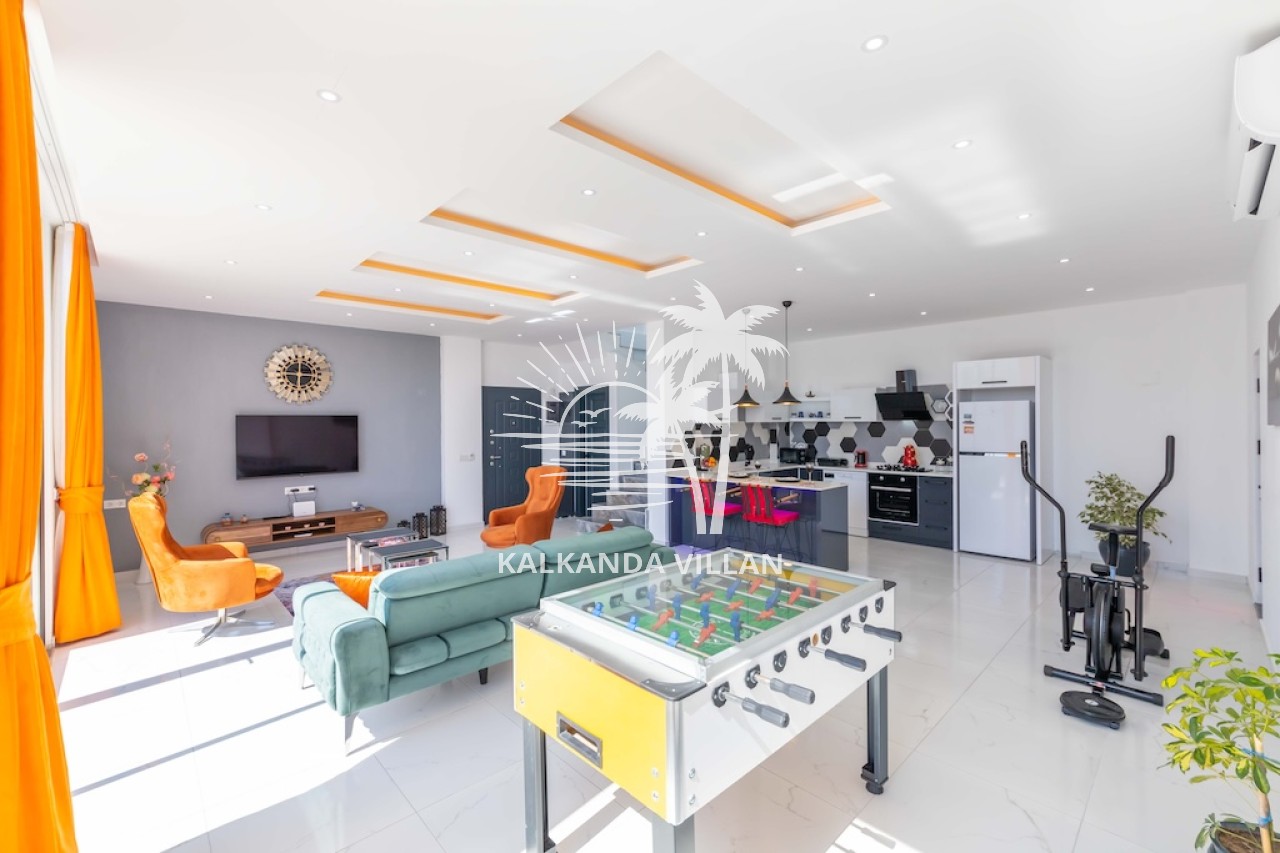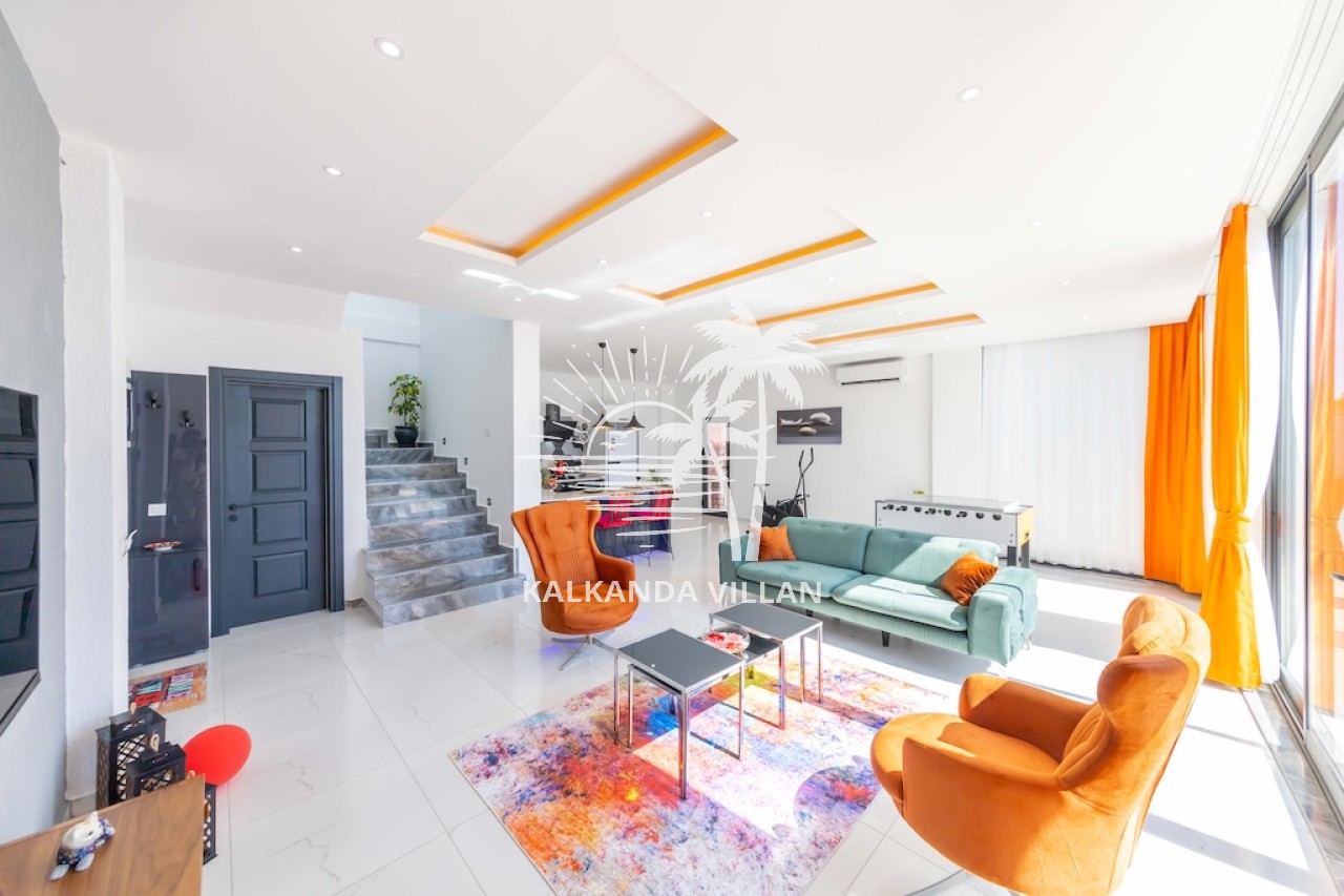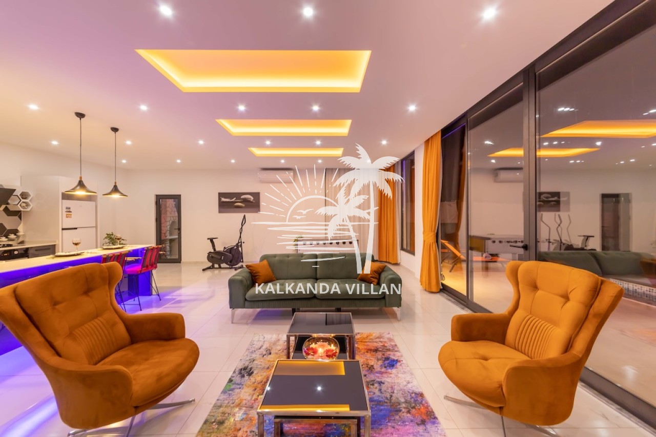 Salon : Salon içerisinde oturma grubu, TV, klima, sehpa bulunmaktadır. Havuz terasına çıkış yapılabilmektedir.