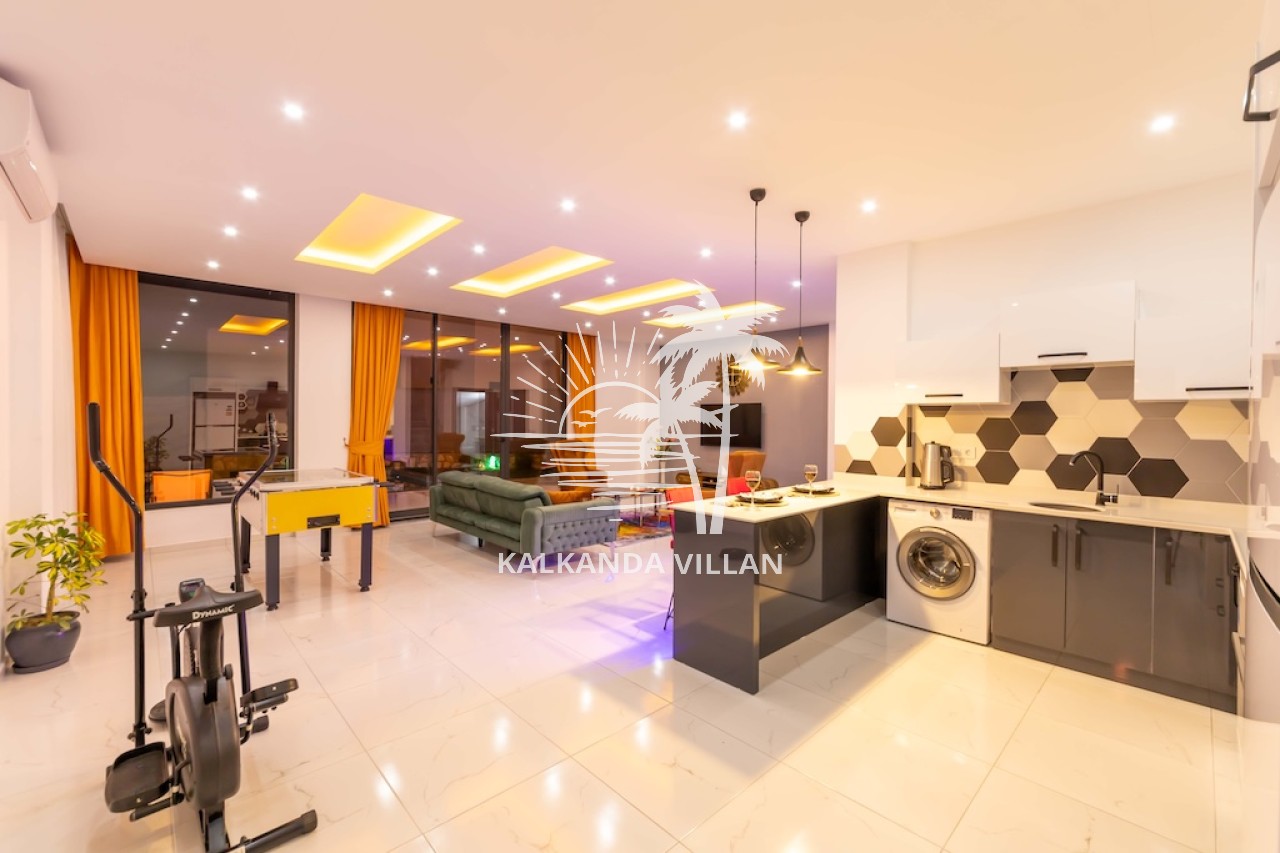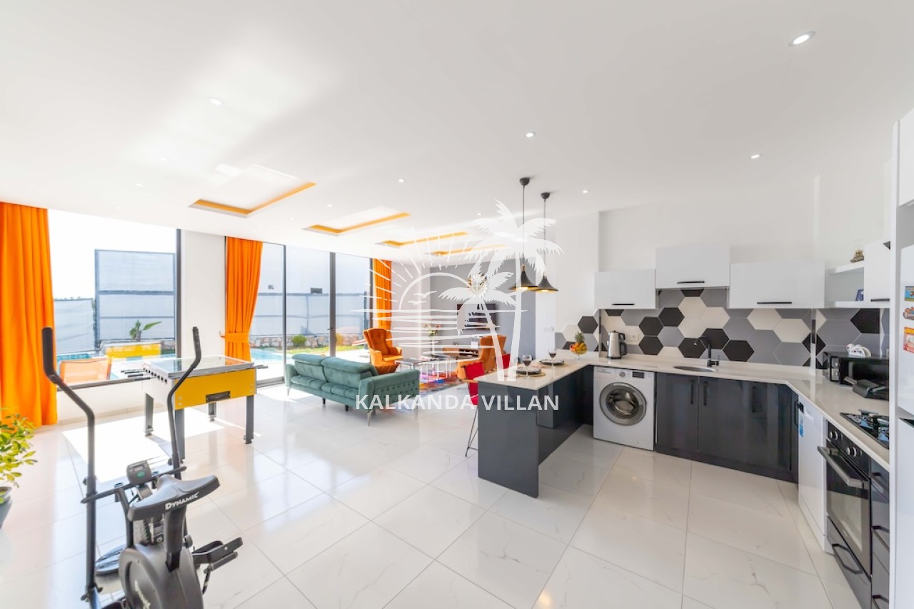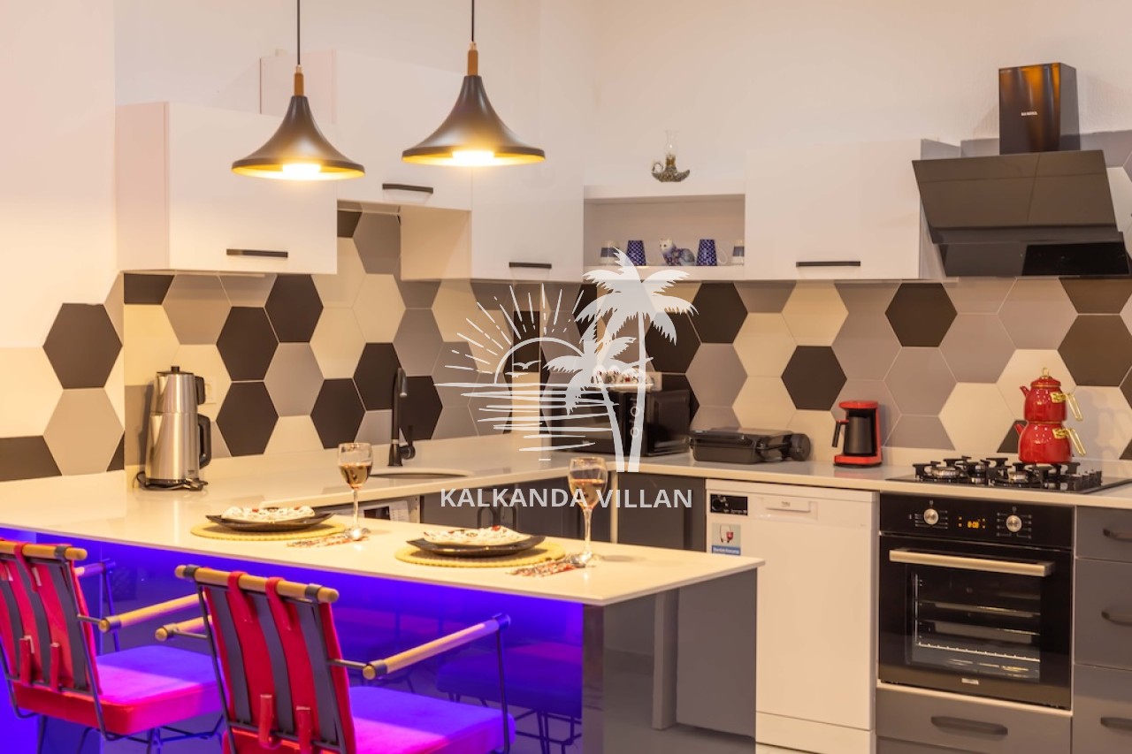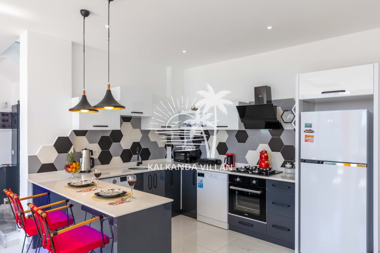 Mutfak : Modern Amerikan mutfak içerisinde buzdolabı, bulaşık makinesi, fırın, ocak, mikrodalga fırın, tost makinesi, yemek masası, yemek takımları, çatal ve bıçak takımları, tencere ve tava takımları, bardaklar bulunmaktadır.