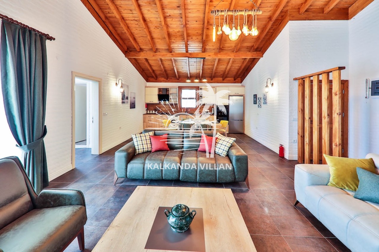 Salon : Salon içerisinde oturma grubu, TV, klima, sehpa bulunmaktadır. Havuz terasına çıkış yapılabilmektedir.